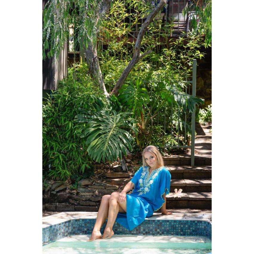ชุดเดรสยาวแบบคาฟทันปักลายสีพื้นสำหรับผู้หญิง คอวี เหมาะสำหรับใส่ไปเที่ยวทะเลหรือรีสอร์ทในฤดูร้อน