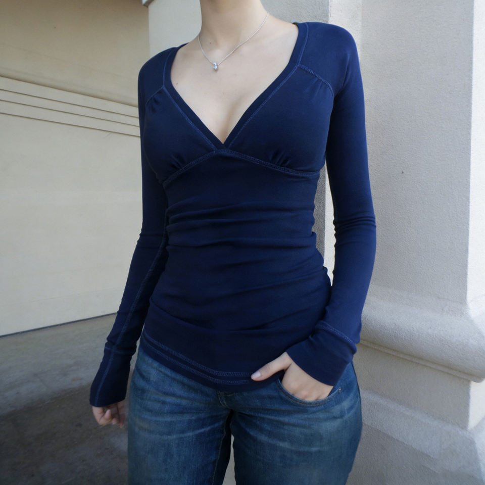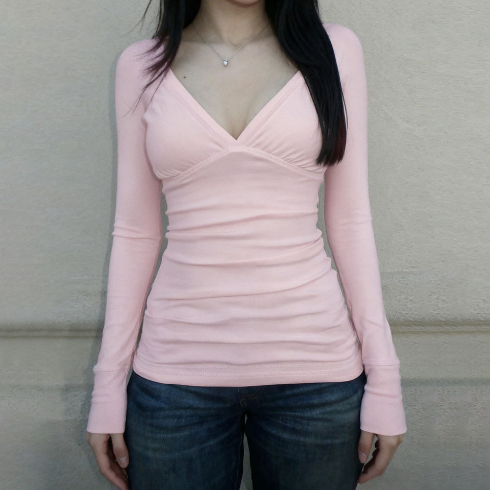 เสื้อยืดแขนยาวคอวีสีพื้นสำหรับผู้หญิง สไตล์ Y2K แฟชั่นลำลอง เสื้อถักอเนกประสงค์