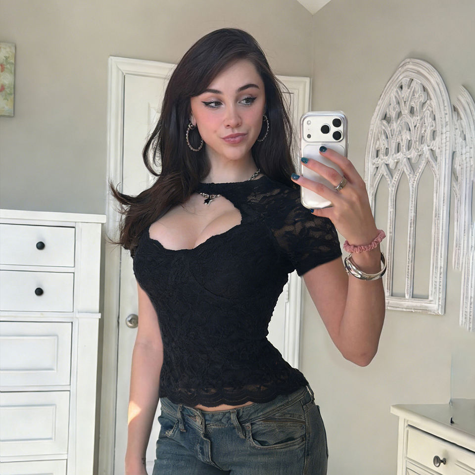 เสื้อยืดคอกลมแขนสั้นแต่งลูกไม้ทรงเข้ารูปสำหรับผู้หญิง สไตล์ลำลอง แฟชั่นพื้นฐานสำหรับฤดูร้อน เสื้อสตรีทแวร์
