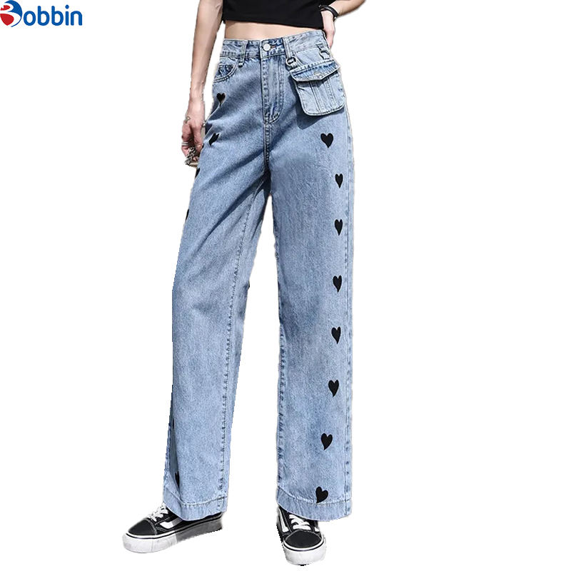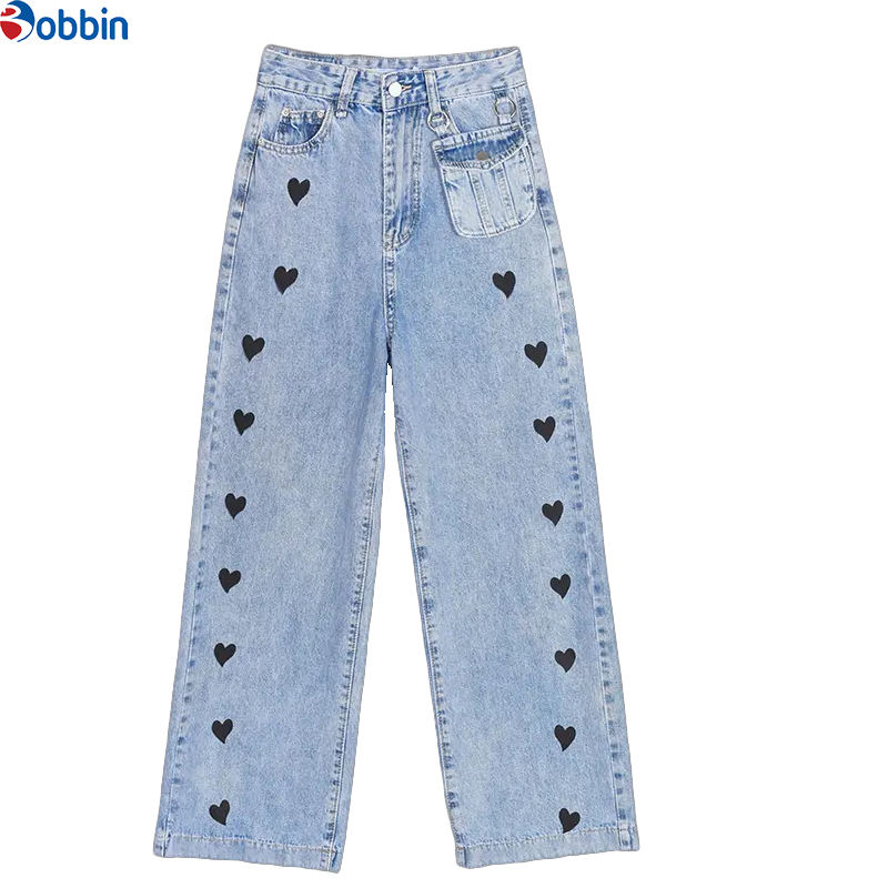 กางเกงยีนส์ทรงตรงเอวสูงมีกระเป๋า สไตล์สตรีทแฟชั่น รุ่นใหม่ยอดนิยม ลายหัวใจ คลาสสิก ทรงหลวม ใส่สบาย