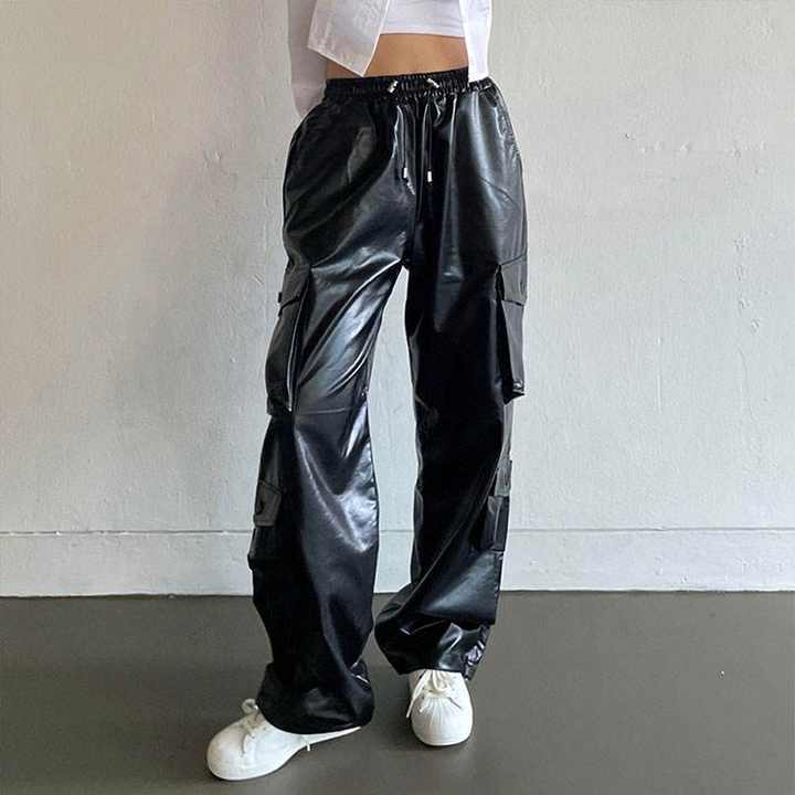 กางเกงคาร์โก้หนังทรงหลวมสไตล์สตรีทแวร์สำหรับผู้หญิง – กางเกงขายาวทรงฮิปปี้เอวสูงมีเชือกผูกสำหรับแฟชั่นลำลองและแฟชั่นในเมือง