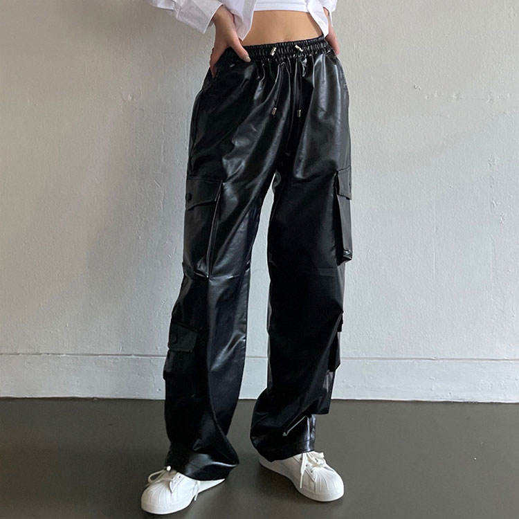 Product name:PU leather cargo baggy pants drawstring hippie trousers