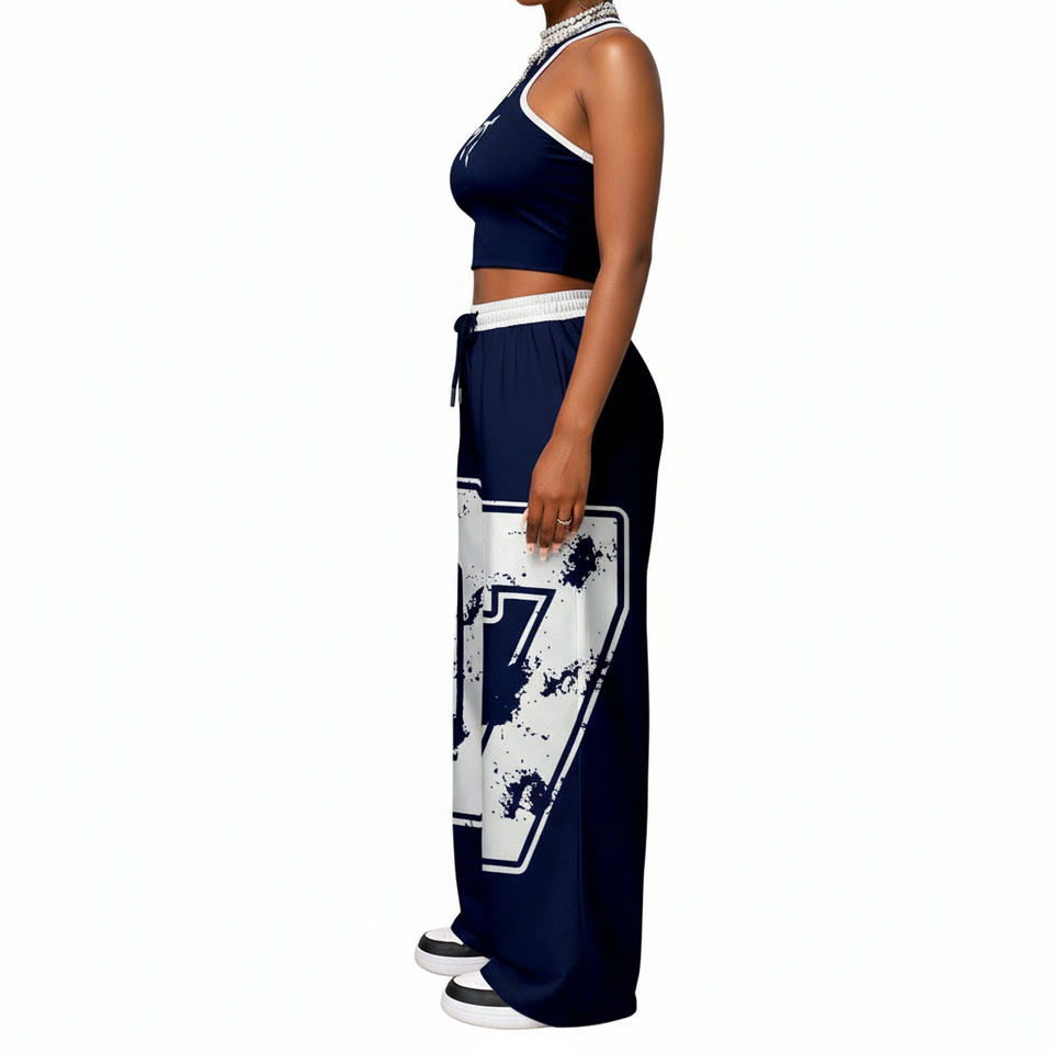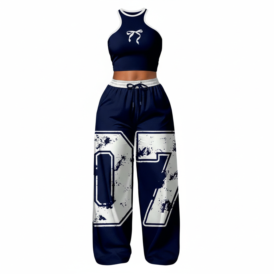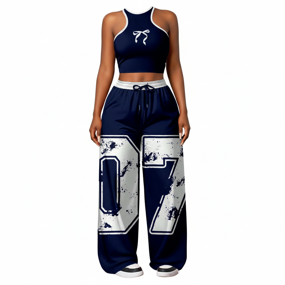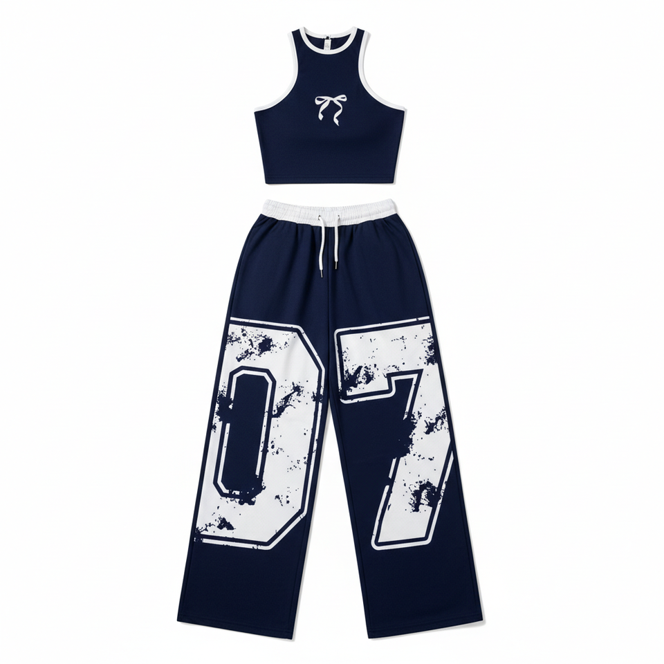ชุดเซ็ตสตรีทแวร์ผู้หญิงสองชิ้น เสื้อครอปท็อปและกางเกงจ็อกเกอร์ พิมพ์ลายกราฟิกตามสั่ง ชุดวอร์มแฟชั่นขายส่ง ชุดคอร์ดเซ็ต