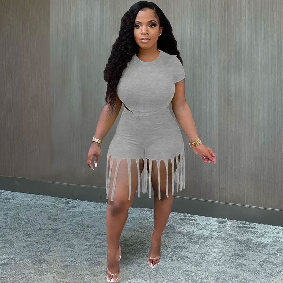 ชุดบอดี้สูทลำลองสำหรับผู้หญิงเสื้อเชิ้ตแขนสั้นมีพู่