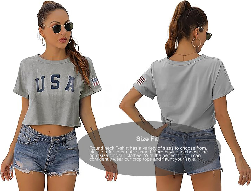 เสื้อครอปแขนสั้นคอกลมทรงหลวมสำหรับผู้หญิงเสื้อครอปฤดูร้อน