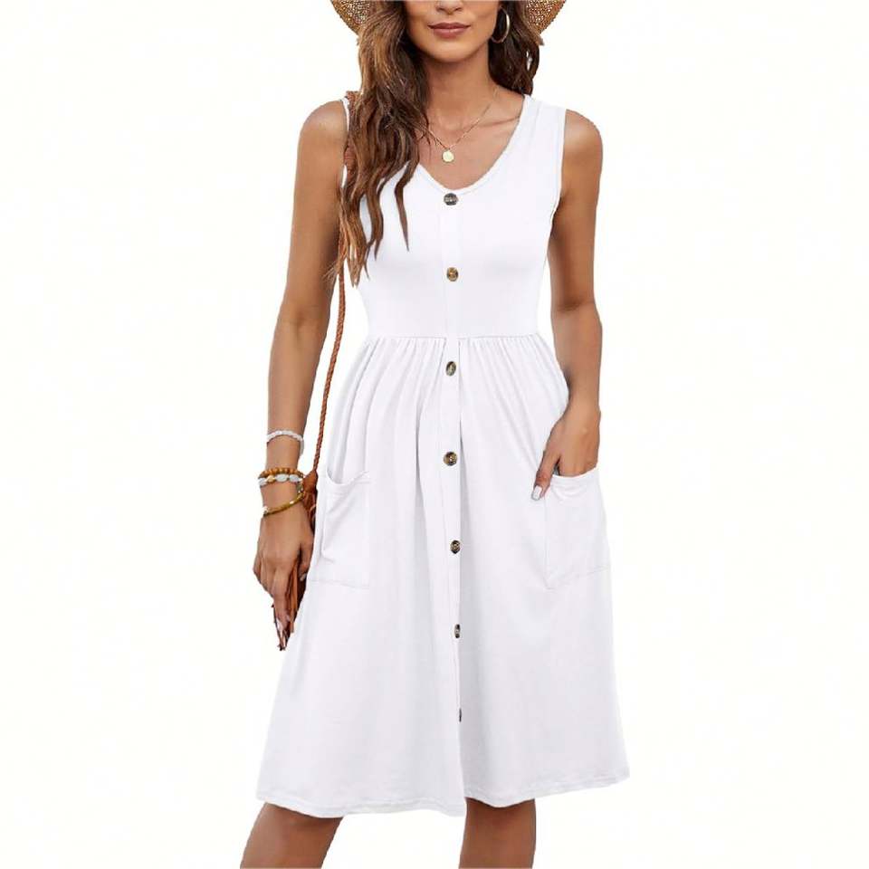 เดรสลำลองแขนกุดสำหรับผู้หญิง, เดรสกระโปรงยาวคลุมเข่ามีกระเป๋าสำหรับฤดูร้อน