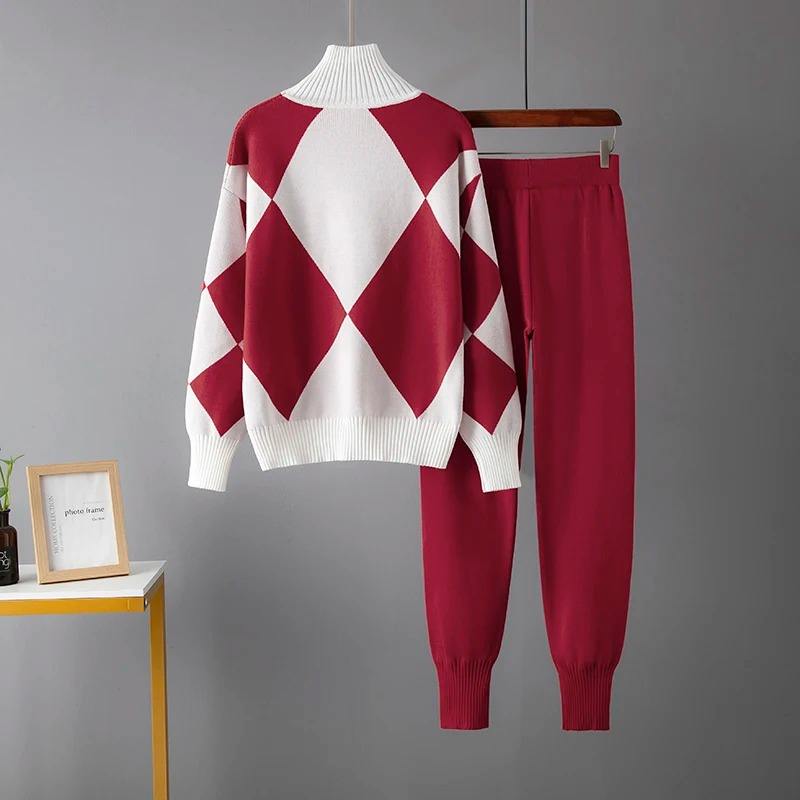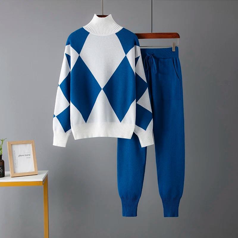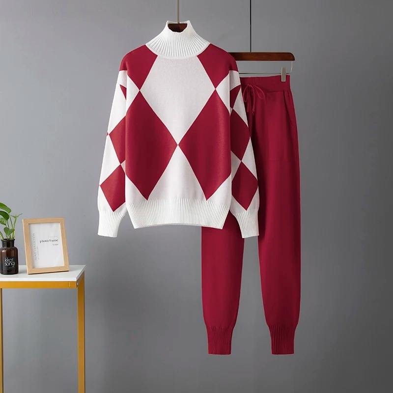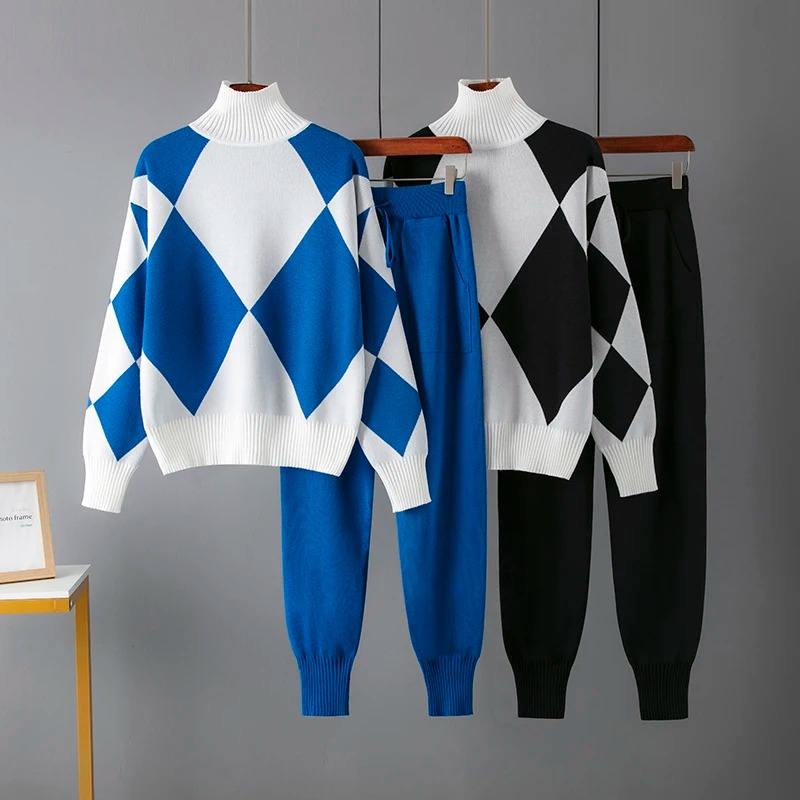 ชุด2ชิ้นเสื้อสเวตเตอร์ถักแบบสวมหัว + กางเกงขายาวแบบลำลองสำหรับฤดูใบไม้ร่วงฤดูหนาว