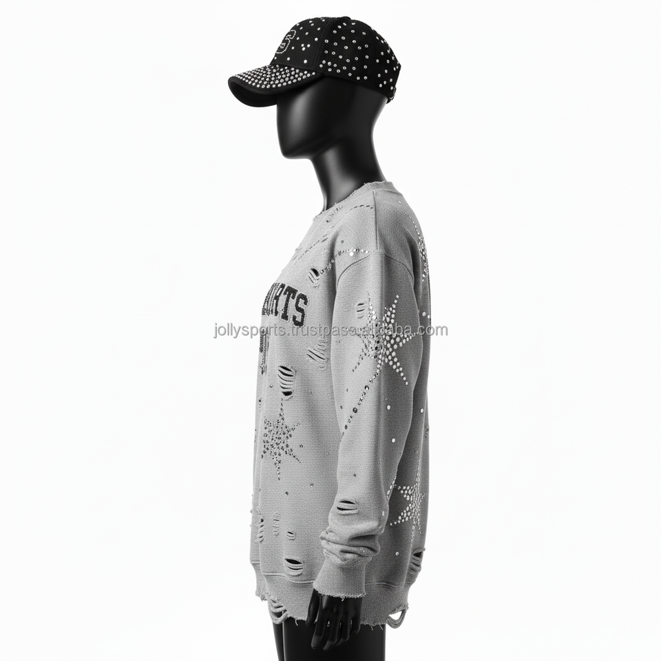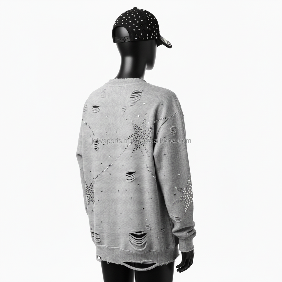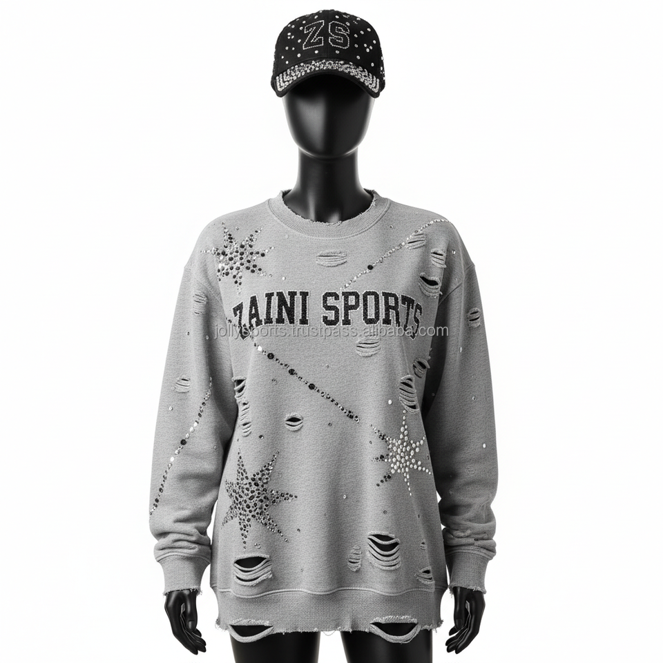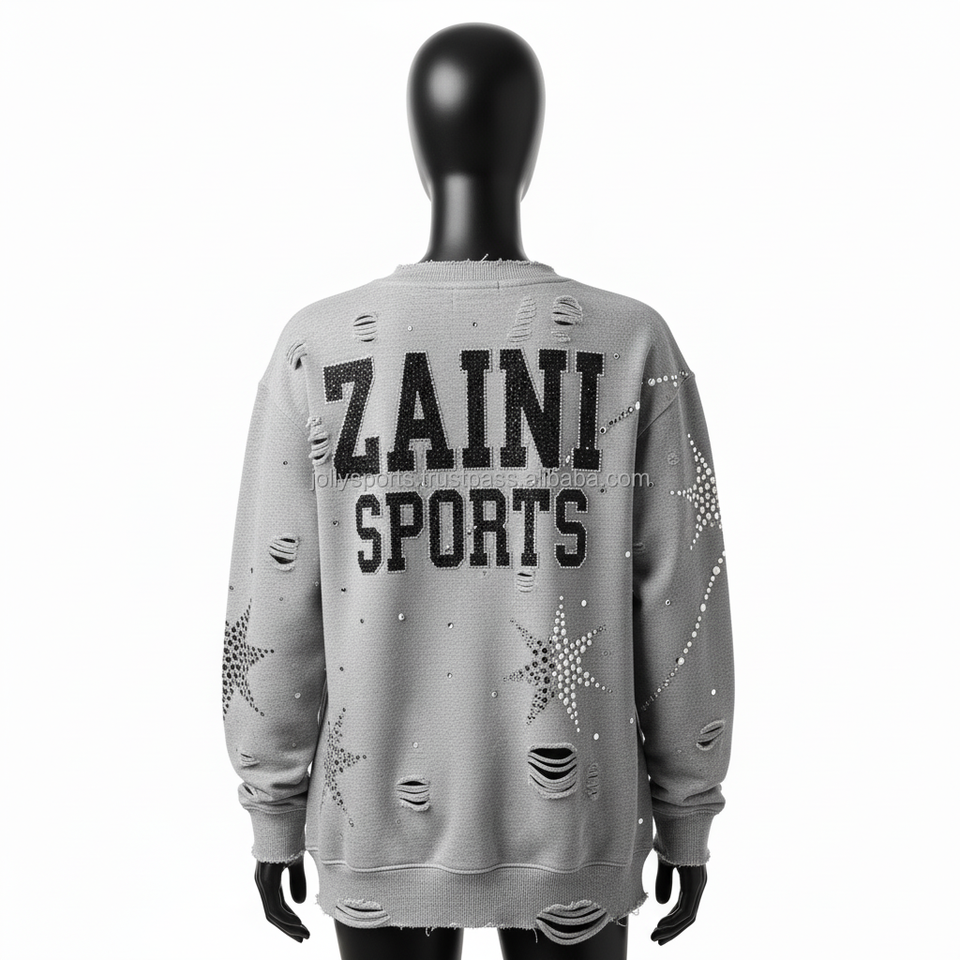 เสื้อกันหนาวสตรี380ผ้าฝ้าย GSM ผ้าฟลีซแบบขาดมีรอยเย็บปักด้วยพลอยเทียมรูปดาวเสื้อกันหนาวระบายอากาศได้ดี