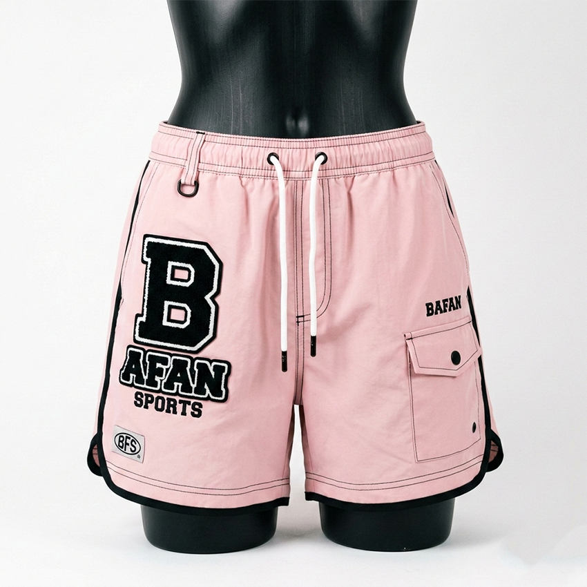 กางเกงว่ายน้ำผู้หญิง ผ้าโพลีเอสเตอร์แห้งเร็ว 140 GSM ซับในตาข่ายสีชมพู แต่งแถบข้างสีดำ ปักโลโก้แบบเชนิลล์ตามสั่ง