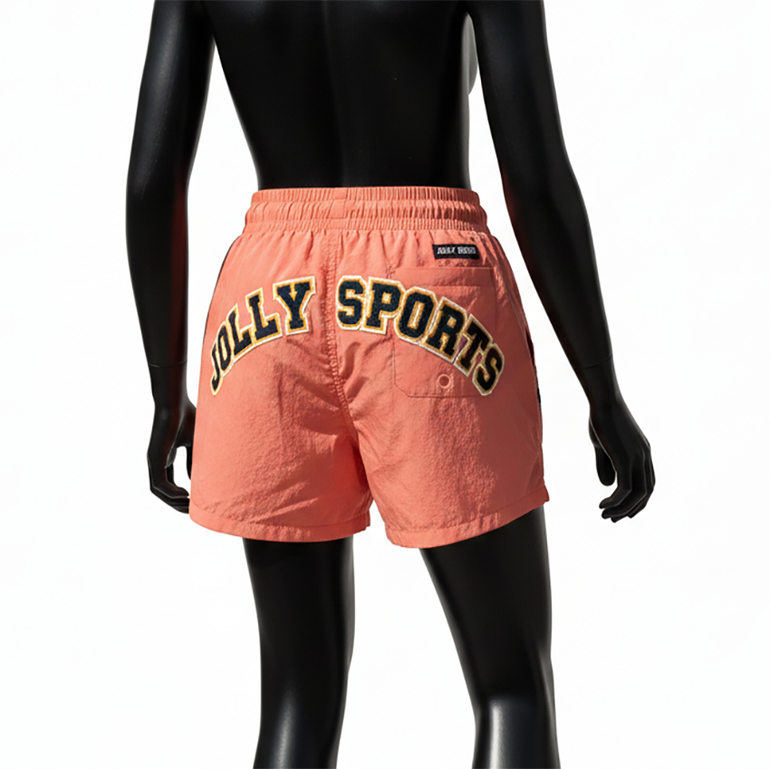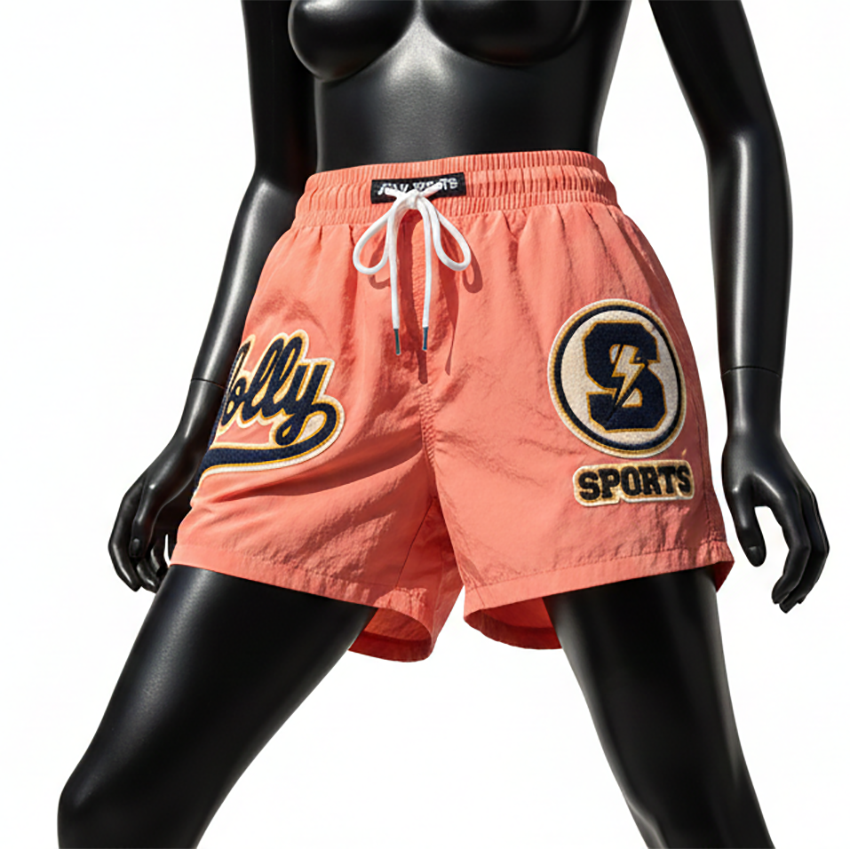 กางเกงว่ายน้ำผู้หญิง ผ้าไนลอนทาสลันคุณภาพสูง 110 GSM สีพีชสำหรับฤดูร้อน พร้อมโลโก้ปัก