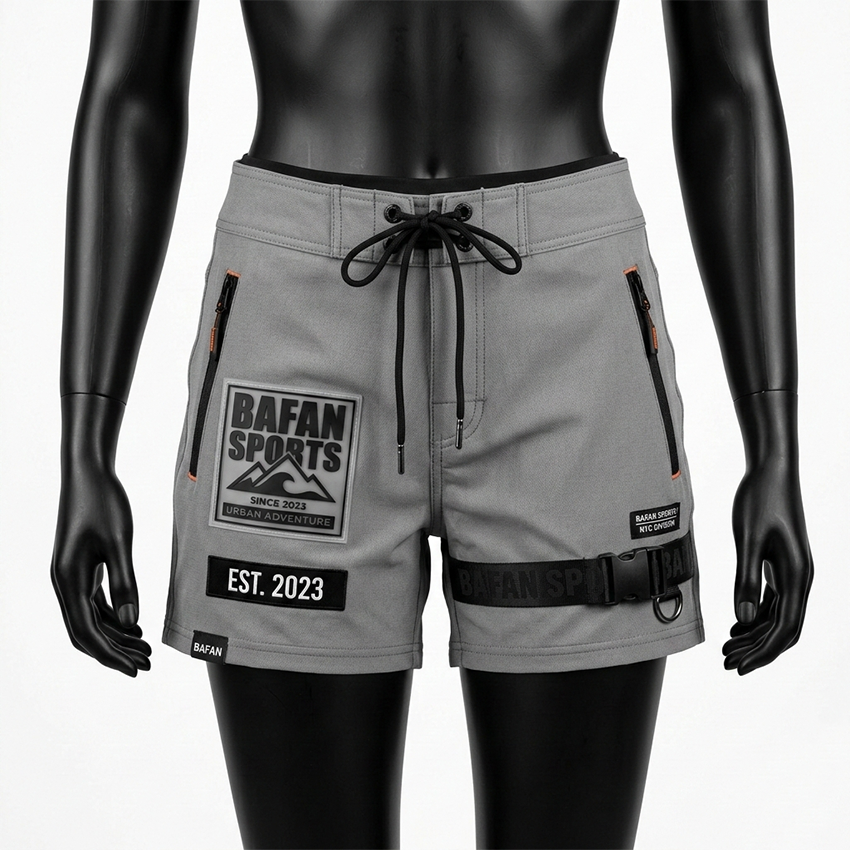 กางเกงขาสั้นว่ายน้ำผู้หญิง คุณภาพสูง ผลิตจากโพลีเอสเตอร์ผสมอีลาสเทน แห้งเร็ว สีเทา-ดำ สไตล์คนเมือง พร้อมแถบยางและโลโก้แบบกำหนดเอง