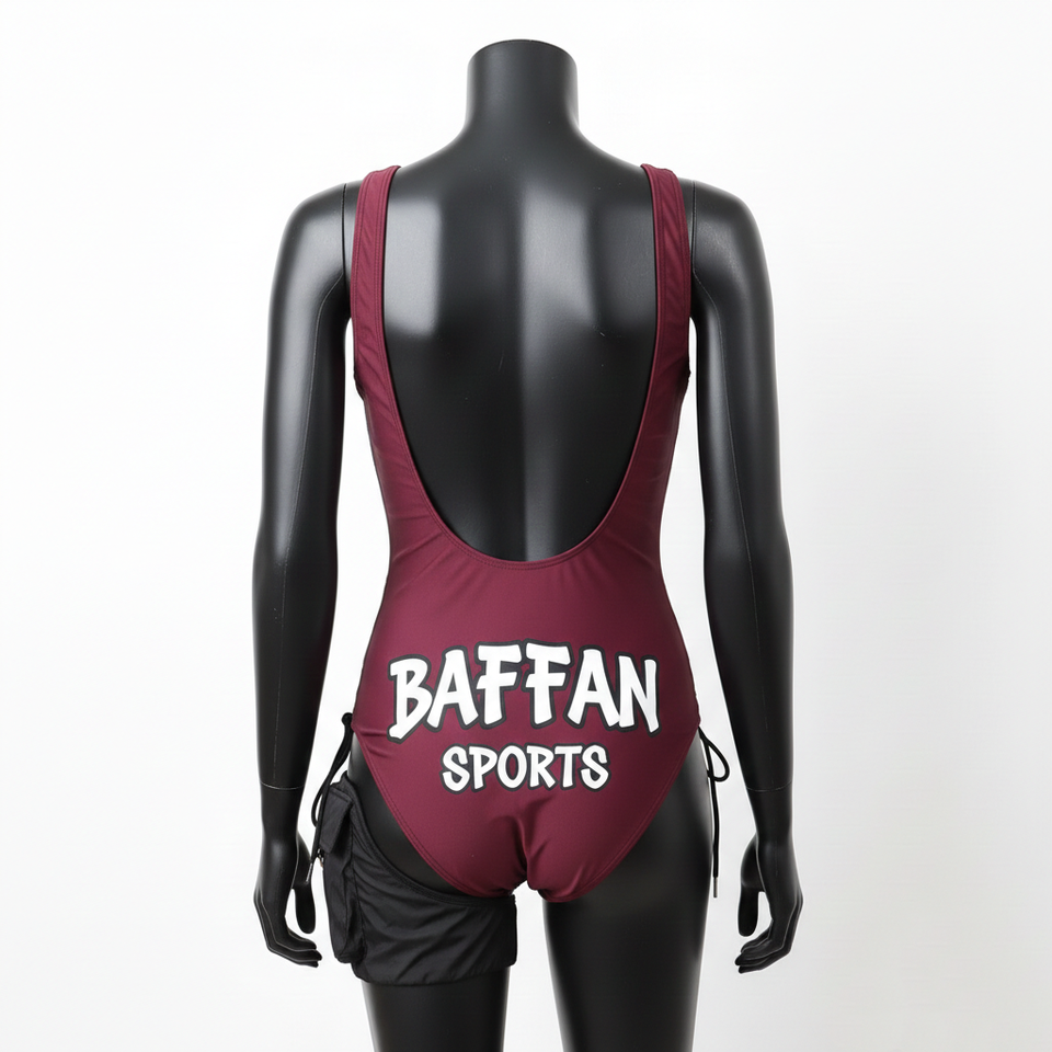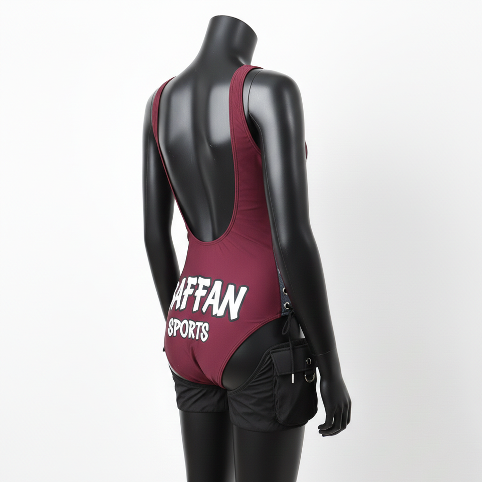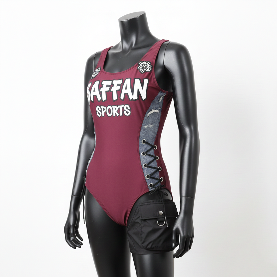 ชุดว่ายน้ำผู้หญิง ผ้าโพลีเอสเตอร์ผสมสแปนเด็กซ์ ยืดหยุ่นสูง 225 GSM สีเบอร์กันดี เกรย์ แต่งลูกไม้ พร้อมโลโก้พิมพ์ลายสกรีน