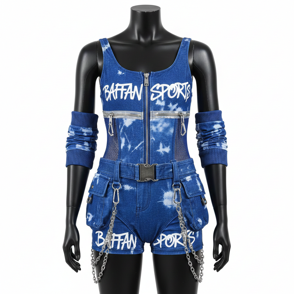 ชุดว่ายน้ำผู้หญิง 225 GSM ผ้าโพลีเอสเตอร์ผสมสแปนเด็กซ์ยืดหยุ่นสูง ลายเดนิม สีฟ้าอมเขียว แต่งผ้าตาข่าย โลโก้แบบซับลิเมชั่น