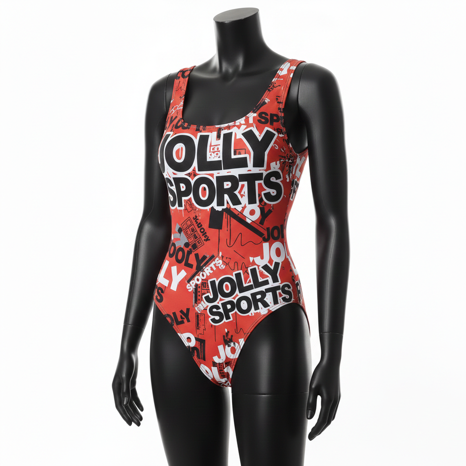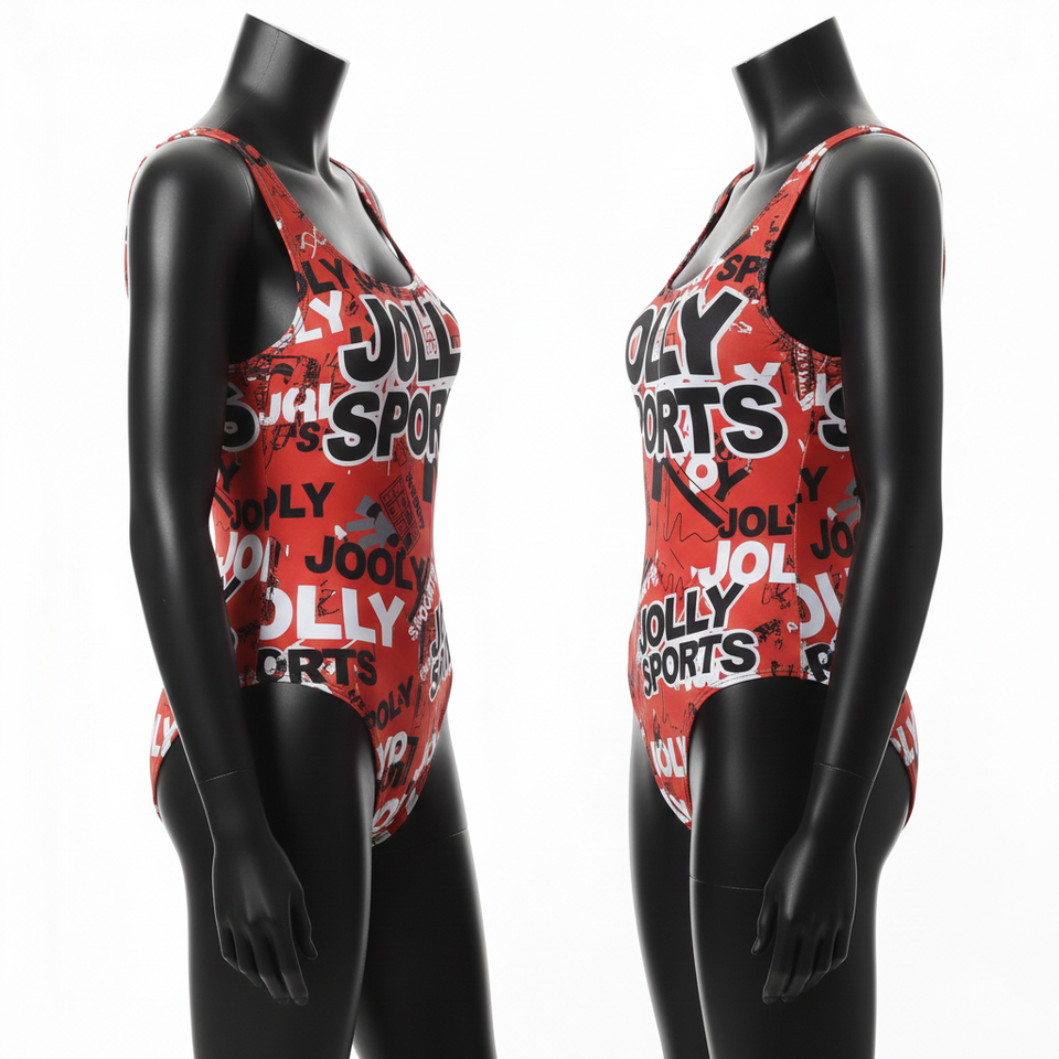 ชุดว่ายน้ำผู้หญิง พรีเมียม โพลีเอสเตอร์ สแปนเด็กซ์ ผ้าสเตรช 210 GSM ลายกราฟิกสีแดง พิมพ์ลายแบบ Sublimation โลโก้สั่งทำได้