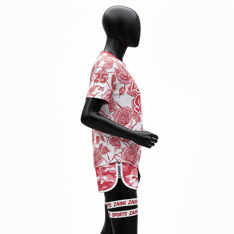 ชุดเสื้อยืดและกางเกงขาสั้นผู้หญิง ผ้าโพลีเอสเตอร์ผสมสแปนเด็กซ์ ยืดหยุ่นสูง น้ำหนักเบา 200 GSM ชุดออกกำลังกาย รับสกรีนโลโก้ ชุดผู้หญิง