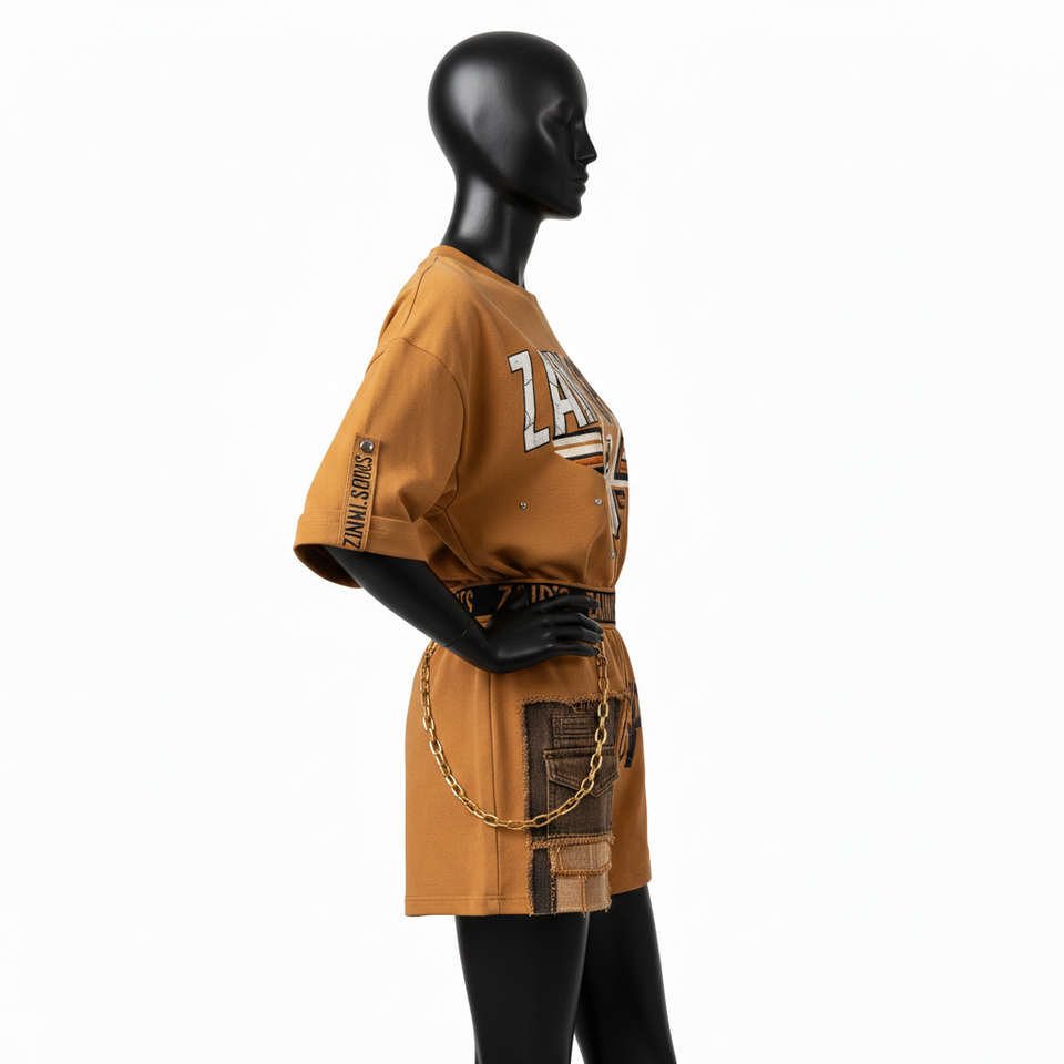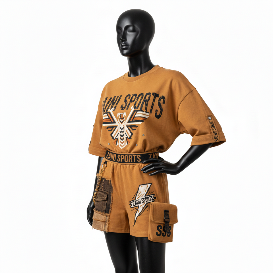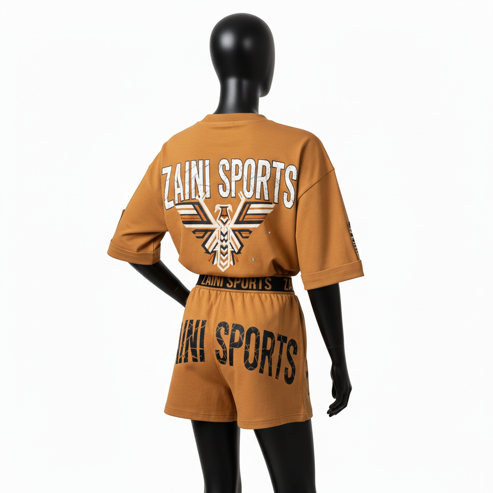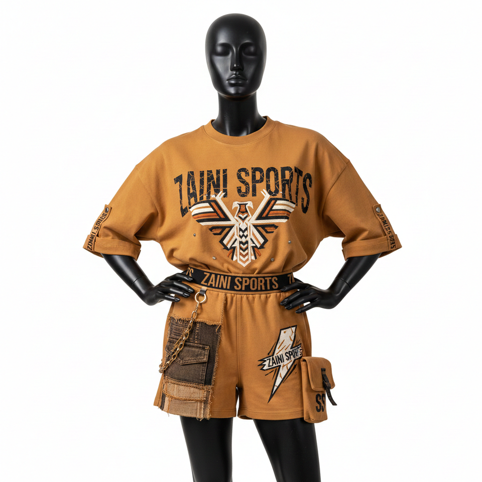 ชุดเสื้อยืดและกางเกงขาสั้นผู้หญิง ผ้าฝ้ายพรีเมียมเนื้อนุ่ม ระบายอากาศได้ดี 240 GSM ตกแต่งด้วยแผ่นผ้าตัดต่อ พร้อมสกรีนลายแบบกำหนดเอง