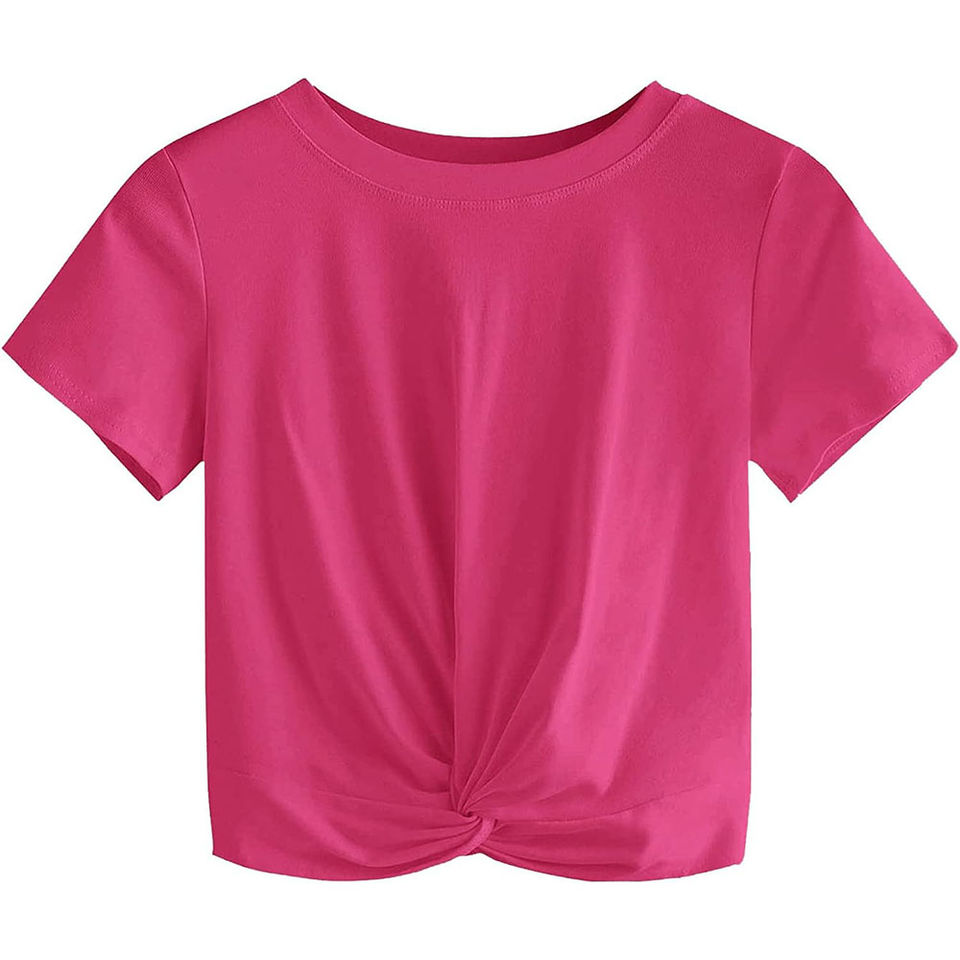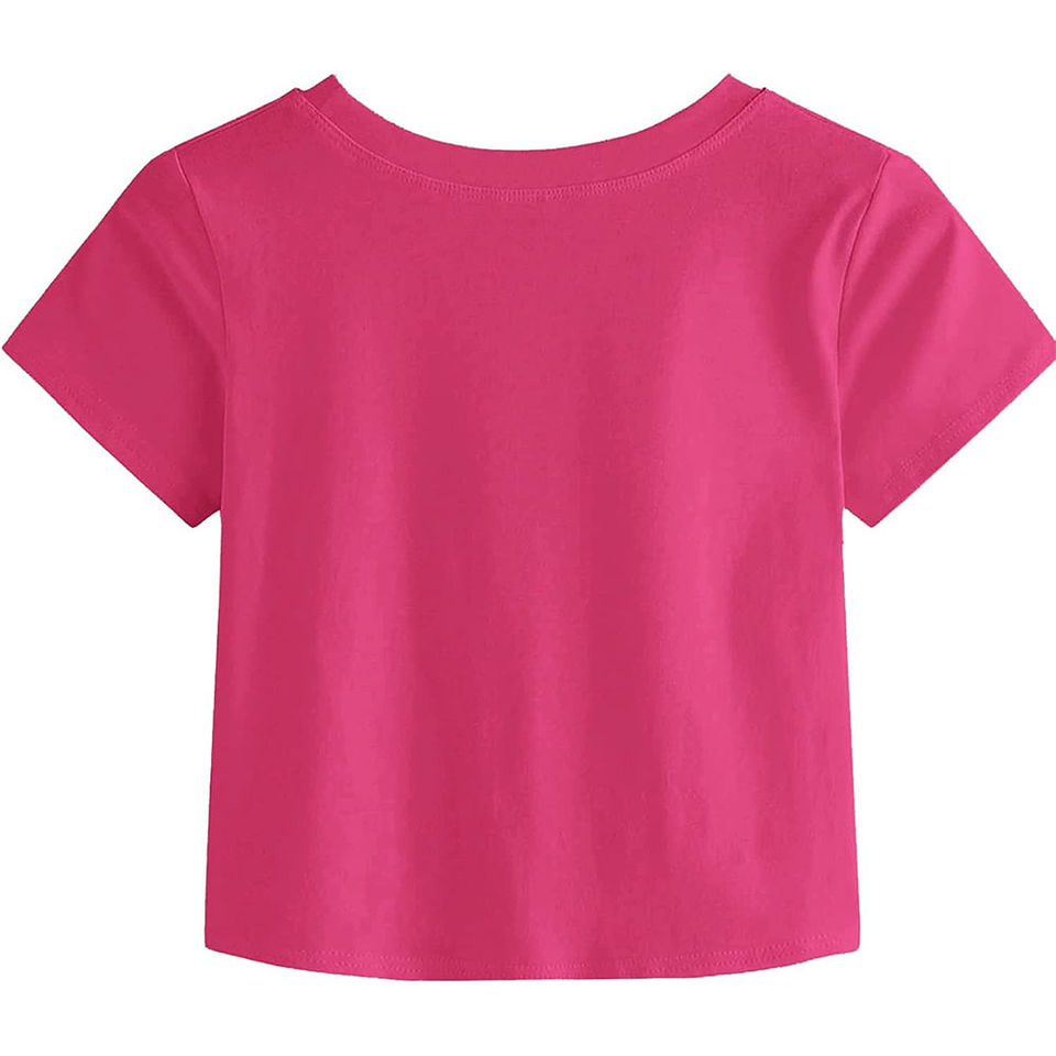 เสื้อครอปแขนสั้นผ้าเทอร์รี่สำหรับผู้หญิง คอกลม สีพื้น พิมพ์ลายดิจิทัล กันยับ ดีไซน์แฟชั่นลำลอง