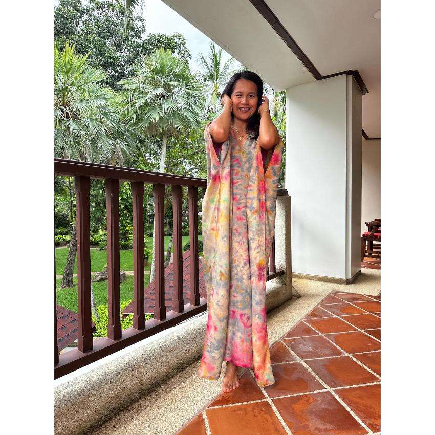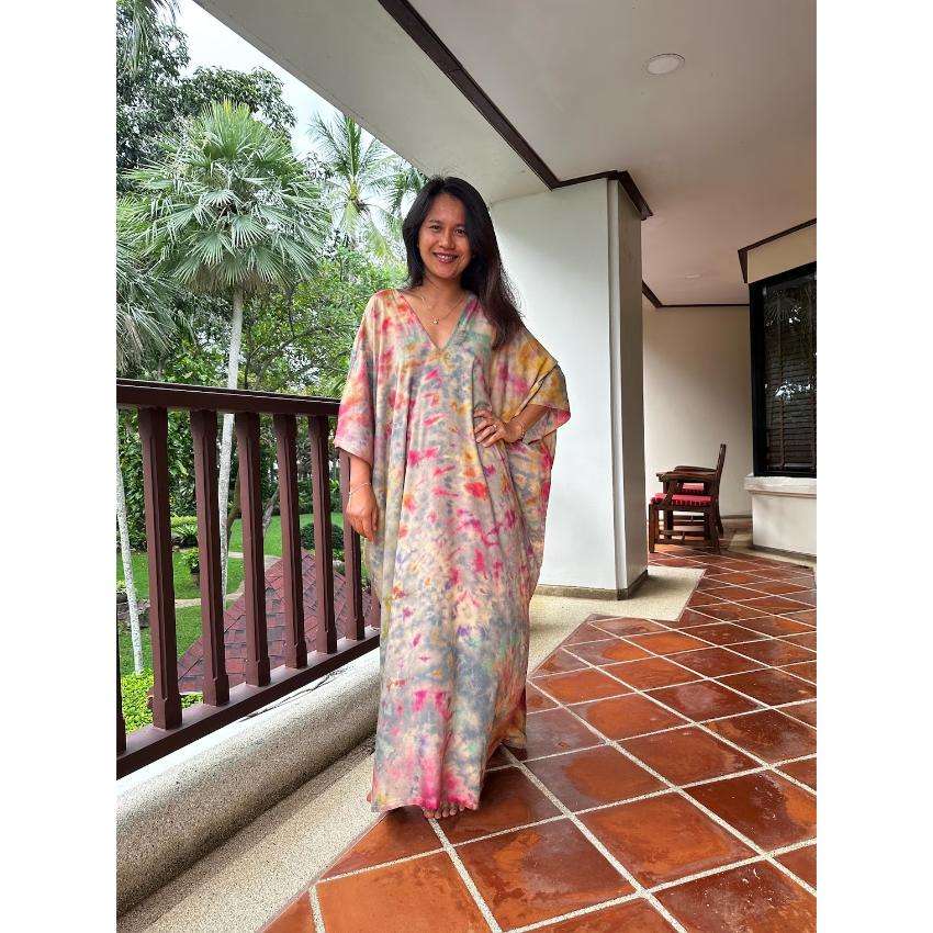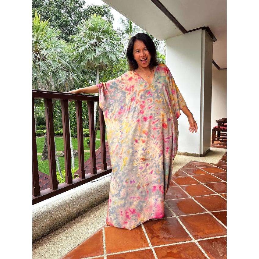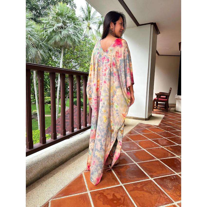 ชุดเดรสยาวแบบคาฟตันลายมัดย้อมสำหรับผู้หญิง ทรงหลวม โอเวอร์ไซส์ เอวธรรมชาติ ซักได้ เป็นมิตรกับสิ่งแวดล้อม เหมาะสำหรับใส่ไปเที่ยวพักผ่อนริมชายหาดในช่วงฤดูร้อน