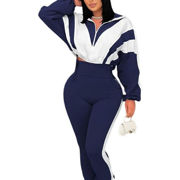 ชุดวอร์มผู้หญิง 2 ชิ้น เสื้อแจ็คเก็ตครอปแขนยาวแบบซิปเต็มตัว กางเกงเลกกิ้งขายาว ชุดออกกำลังกาย