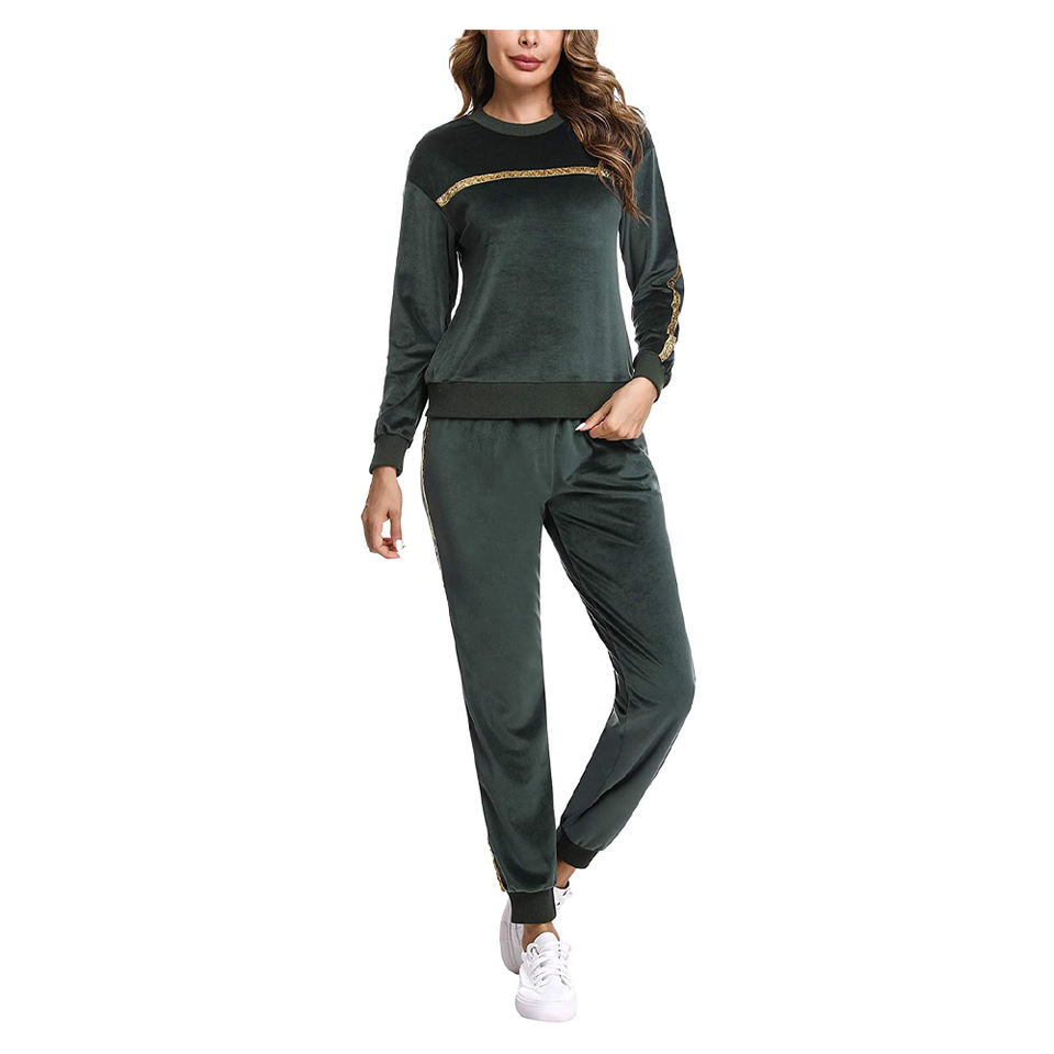 ชุดวอร์มผู้หญิงพร้อมกางเกงขาเรียวและชุดวอร์มผู้หญิงเอวยางยืดมีผ้ากำมะหยี่ดีไซน์พิมพ์ลาย