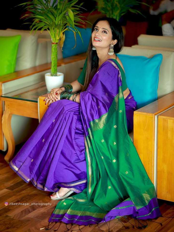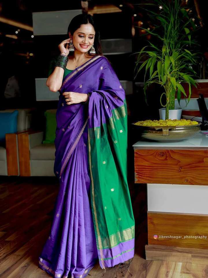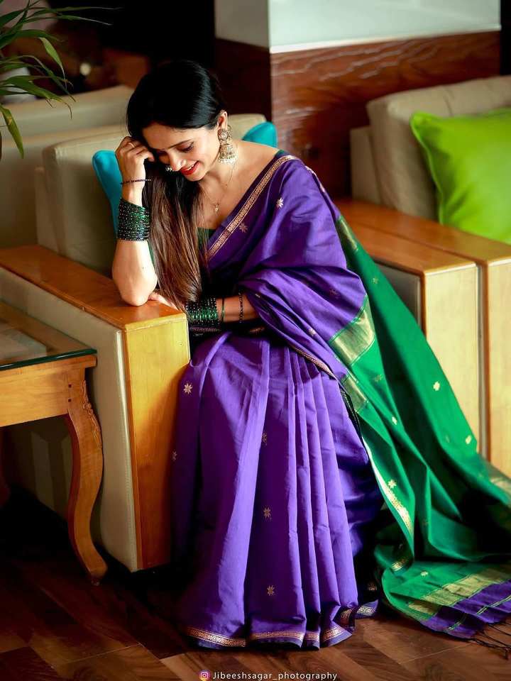 ชุดส่าหรีสีม่วงแบบดั้งเดิมสำหรับผู้หญิง พร้อมขอบสีเขียวตัดกัน ประดับด้วยลายปักดิ้นทอง ดีไซน์เนอร์ชุดส่าหรีสำหรับงานแต่งงาน
