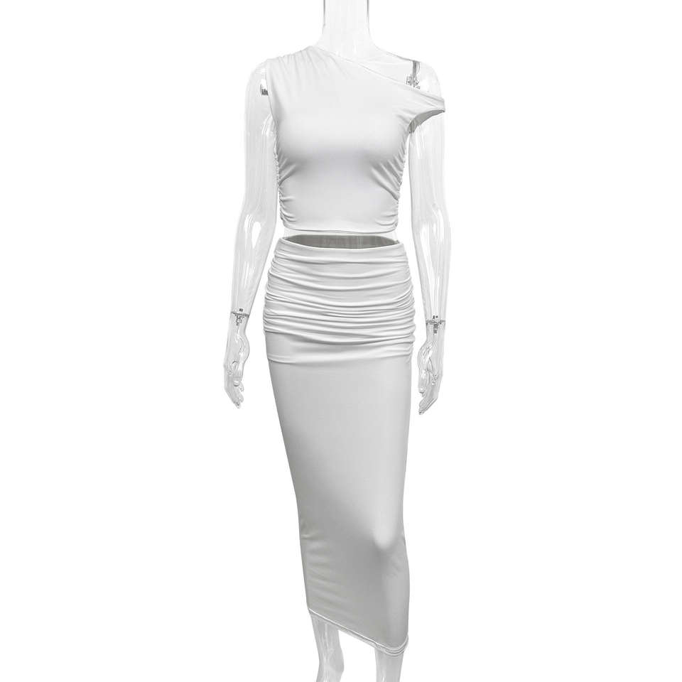 ชุดเซ็ตสองชิ้นสำหรับผู้หญิง เสื้อครอปแขนยาวเปิดไหล่ข้างเดียว กระโปรงยาวระดับกลาง ดีไซน์หรูหรา ชุดเซ็ตกระโปรงเซ็กซี่สำหรับผู้หญิง