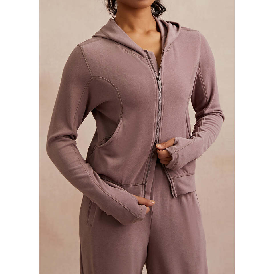 ชุดเซ็ตเสื้อฮู้ดซิปสองชิ้นและกางเกงขายาวสีม่วงอ๊อกซ์ฟอร์ดสำหรับผู้หญิง เหมาะสำหรับฤดูหนาว สไตล์ลำลอง ชุดเข้าชุดกัน ทรงปกติ