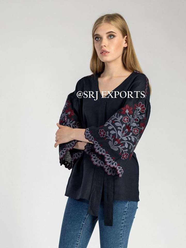 เสื้อสตรีคอวีมีสไตล์ที่น่าสนใจเสื้อเบลาส์เข็มขัดกว้างปักลายสีน้ำเงินเข้มเข้มแขนกระดิ่งแบบหรูหรา