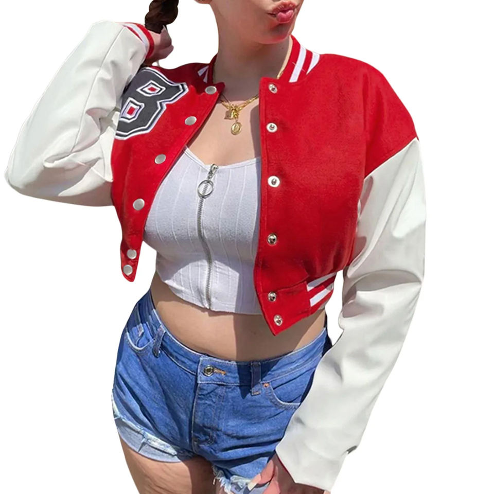 เสื้อแจ็คเก็ตวาร์ซิตี้ผู้หญิง แขนยาว ทรงครอป สไตล์เบสบอล บอมเบอร์โค้ท สตรีทแวร์ เสื้อแจ็คเก็ตเลตเตอร์แมนทรงครอปสำหรับผู้หญิง