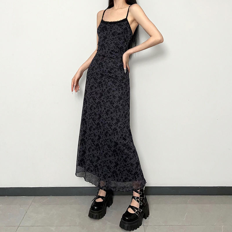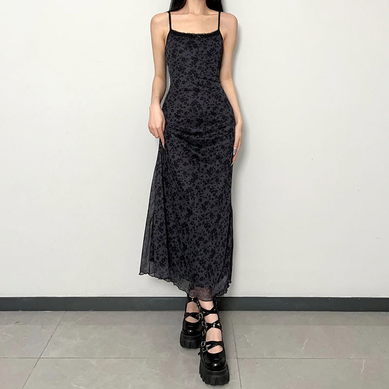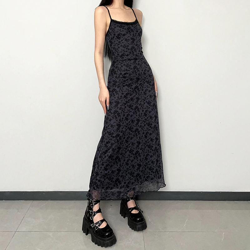 เดรสลูกไม้พิมพ์ลายดอกไม้สไตล์วินเทจสำหรับผู้หญิง แต่งผ้าตาข่ายแบบเย็บต่อกัน ทรงมิดิ แขนกุด สไตล์ Y2K แฟชั่นฤดูร้อน