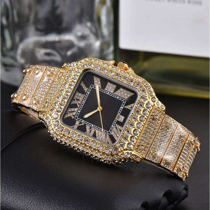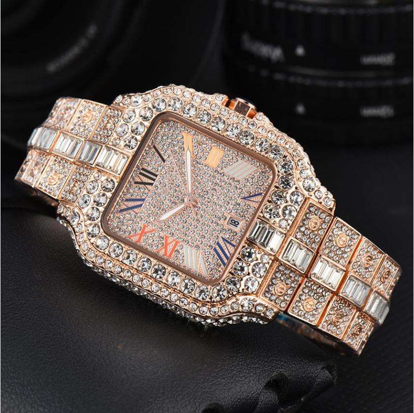 นาฬิกาข้อมือผู้หญิง แฟชั่นหรูหรา แสดงวันที่ ควอตซ์ ประดับเพชรเต็มเรือน นาฬิกาผู้หญิงสีทอง สแตนเลสสตีล ธุรกิจ นาฬิกาเพชร