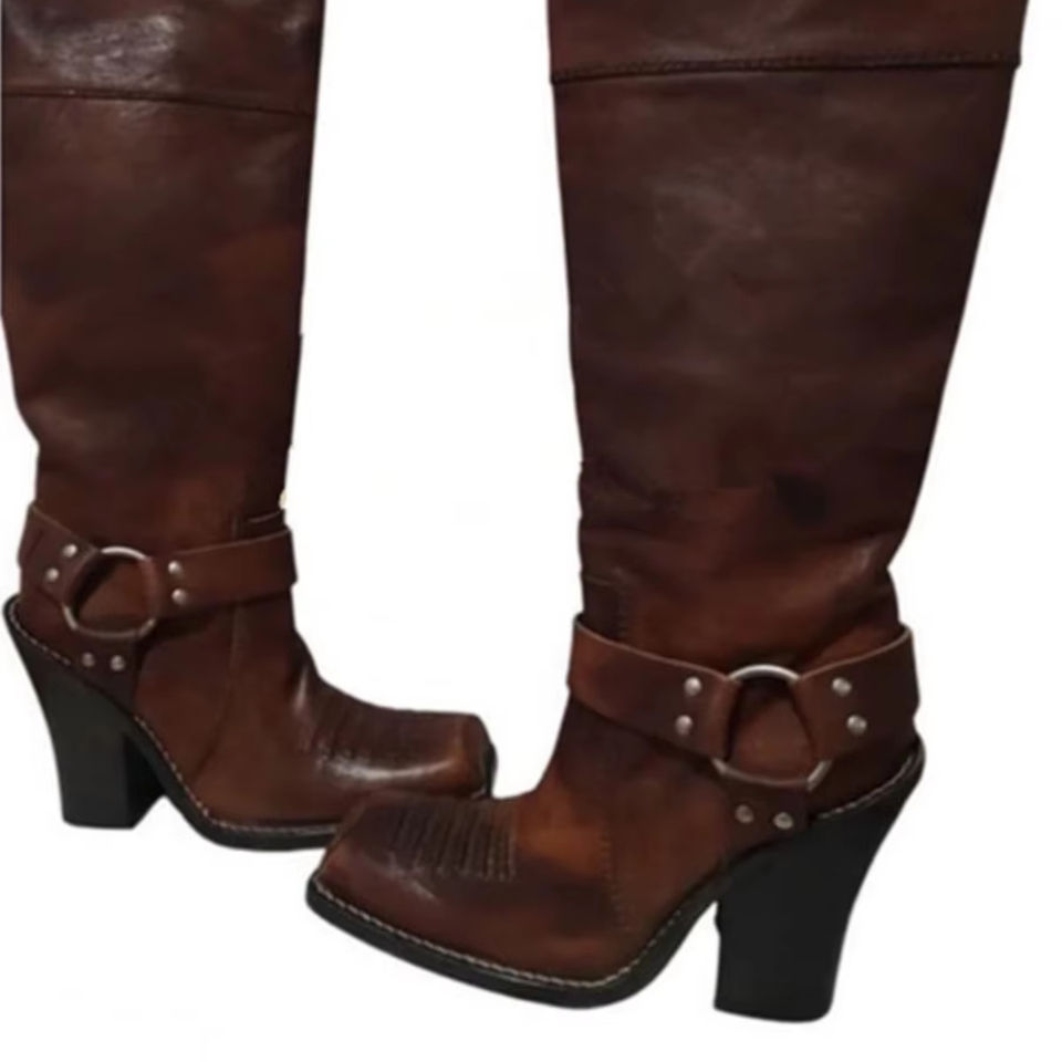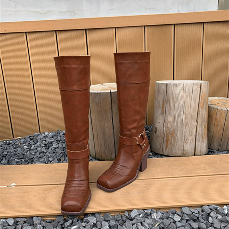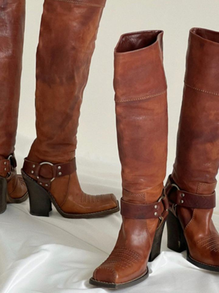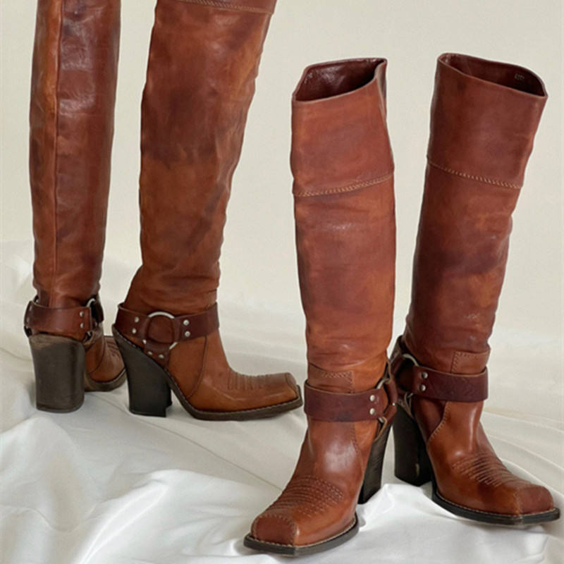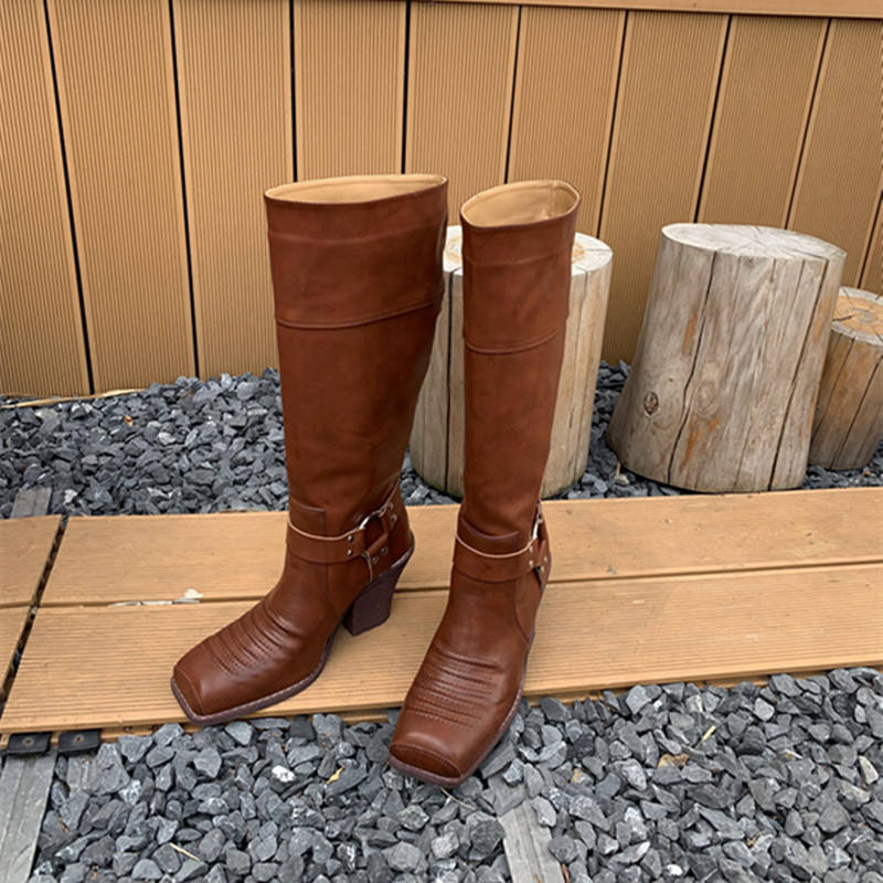 รองเท้าบูทผู้หญิงหนังวัวครึ่งน่องสไตล์ตะวันตกสไตล์การขับขี่แบบคลาสสิกหนังแท้ดีไซน์ตะเข็บแนววินเทจรองเท้าสวมใส่สบายทนทาน