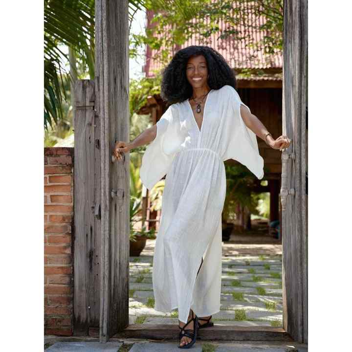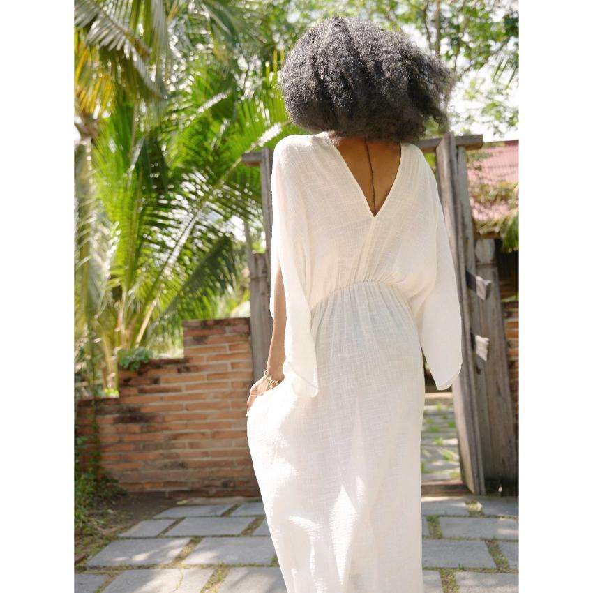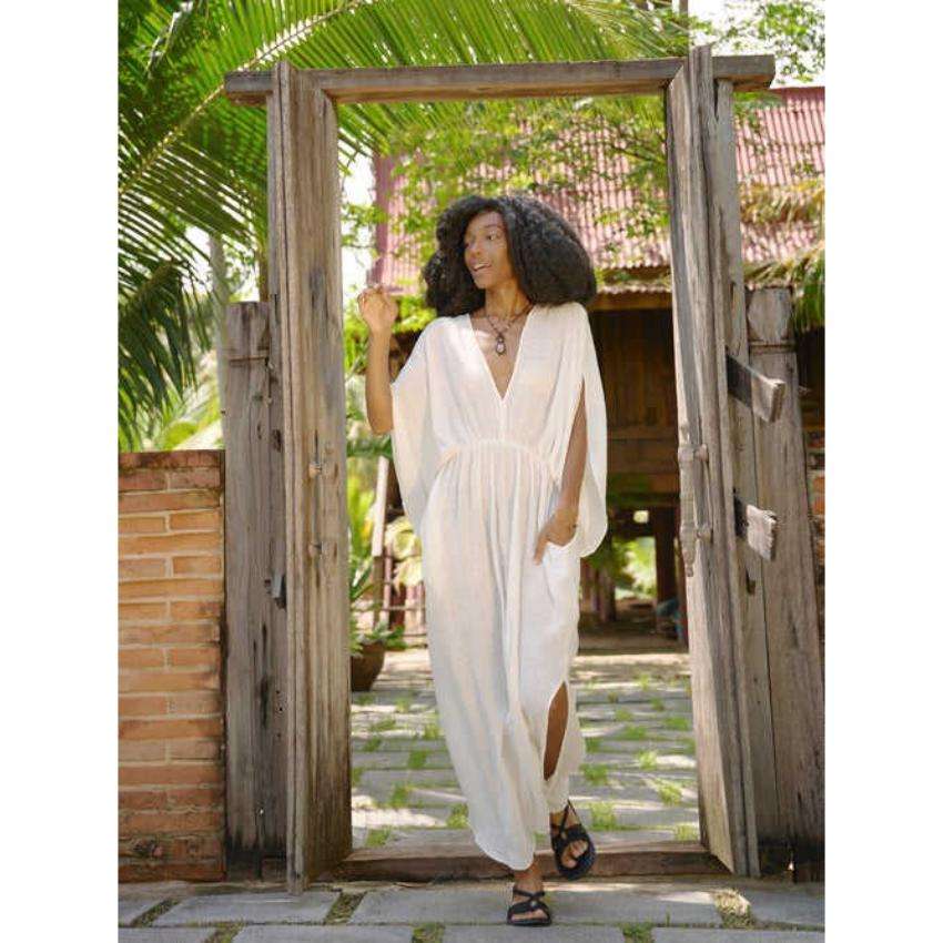 ชุดเดรสผ้าฝ้ายสีขาวสไตล์โบฮีเมียนสำหรับผู้หญิง ทรงหลวม คอวี ยาวคลุมเท้า ซักได้ เหมาะสำหรับใส่ไปเที่ยวทะเลหรือพักผ่อนในฤดูร้อน