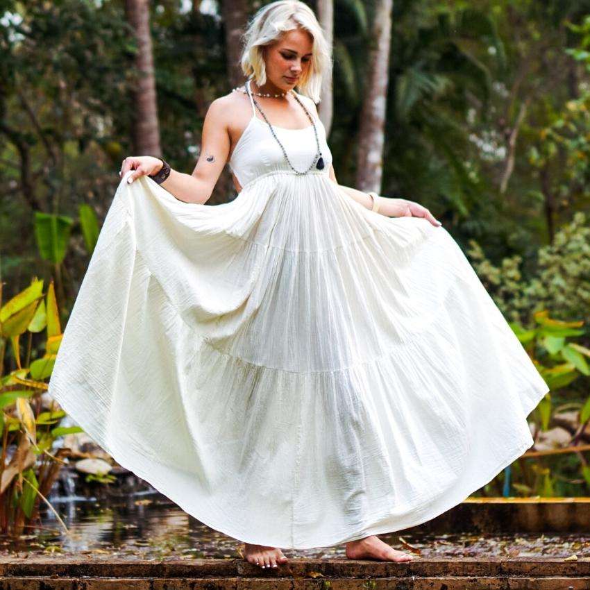 เดรสยาวสีขาวสไตล์โบฮีเมียนสำหรับผู้หญิง แขนยาว ผ้าฝ้ายเนื้อนุ่ม ระบายอากาศได้ดี ซักได้ เหมาะสำหรับใส่ไปเที่ยวทะเล รีสอร์ท หรืองานเทศกาลในช่วงฤดูร้อน