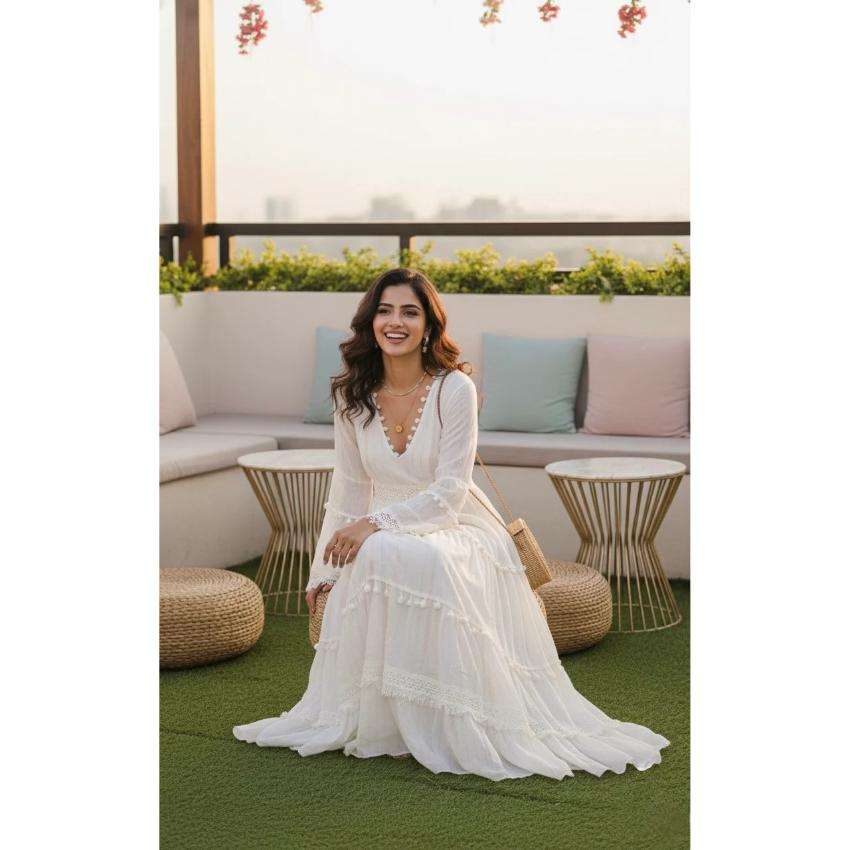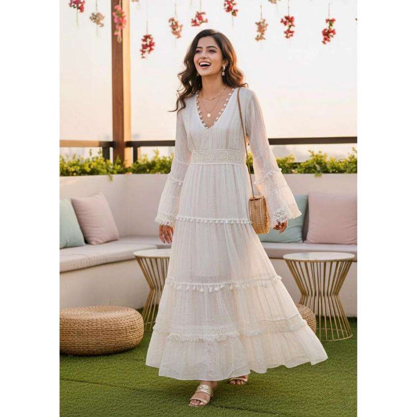 ชุดเดรสยาวสีขาวสไตล์โบฮีเมียนสำหรับผู้หญิง คอวีลึก แขนกระดิ่ง เหมาะสำหรับใส่ไปเที่ยวทะเล รีสอร์ท งานแต่งงาน หรืองานปาร์ตี้