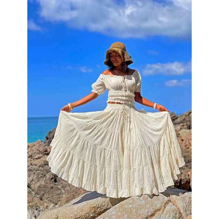 ชุดเซ็ตสองชิ้นสไตล์โบฮีเมียนสีขาวสำหรับผู้หญิง เสื้อครอปเปิดไหล่แต่งสม็อค กระโปรงยาวทรงพลิ้วระบายเป็นชั้นๆ เหมาะสำหรับใส่ไปเที่ยวชายหาดหรือรีสอร์ท