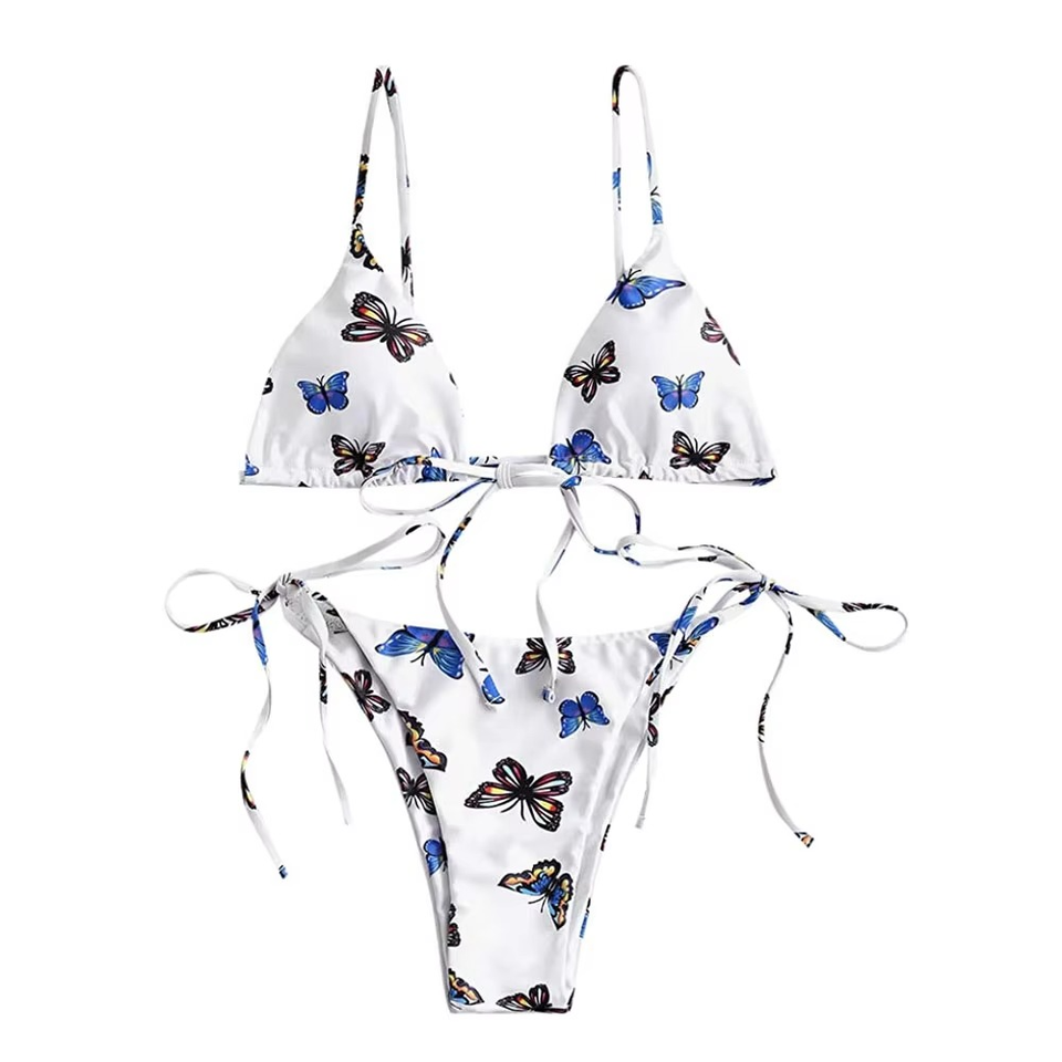 ชุดบิกินี่ผู้หญิงสีขาวลายผีเสื้อ ทรงสามเหลี่ยมผูกเชือกด้านข้าง เซ็กซี่ ชุดว่ายน้ำสองชิ้น ชุดชายหาด สำหรับฤดูร้อน ขายส่ง