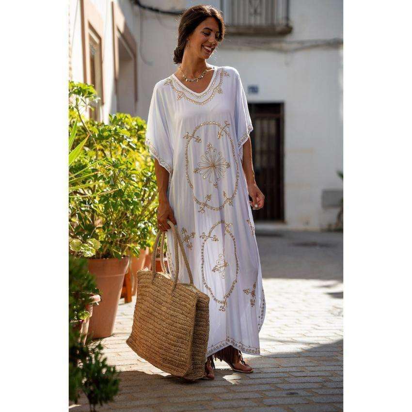 ชุดเดรสยาวแบบคาฟทันปักลายสีขาวทองสำหรับผู้หญิง สไตล์โบฮีเมียน ชุดชายหาด ผ้าฝ้ายทรงหลวม เหมาะสำหรับใส่พักผ่อนริมทะเล เอวธรรมชาติ