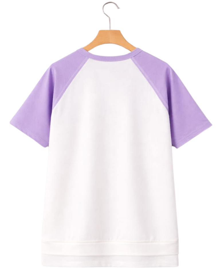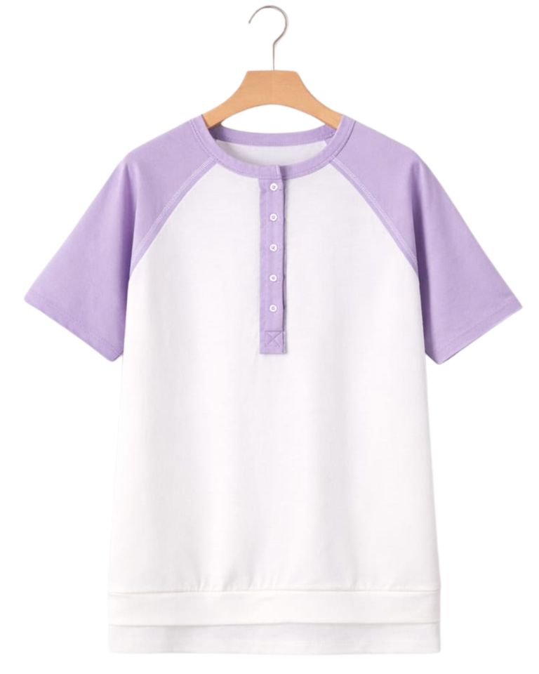 เสื้อยืดแขนสั้นผู้หญิงสีขาวลาเวนเดอร์ แขนเสื้อแบบแร็กแลน คอเฮนลีย์ ผ้าคอตตอนผสม สไตล์ลำลอง เสื้อฤดูร้อน ทันสมัย เรียบง่าย เนื้อผ้านุ่ม