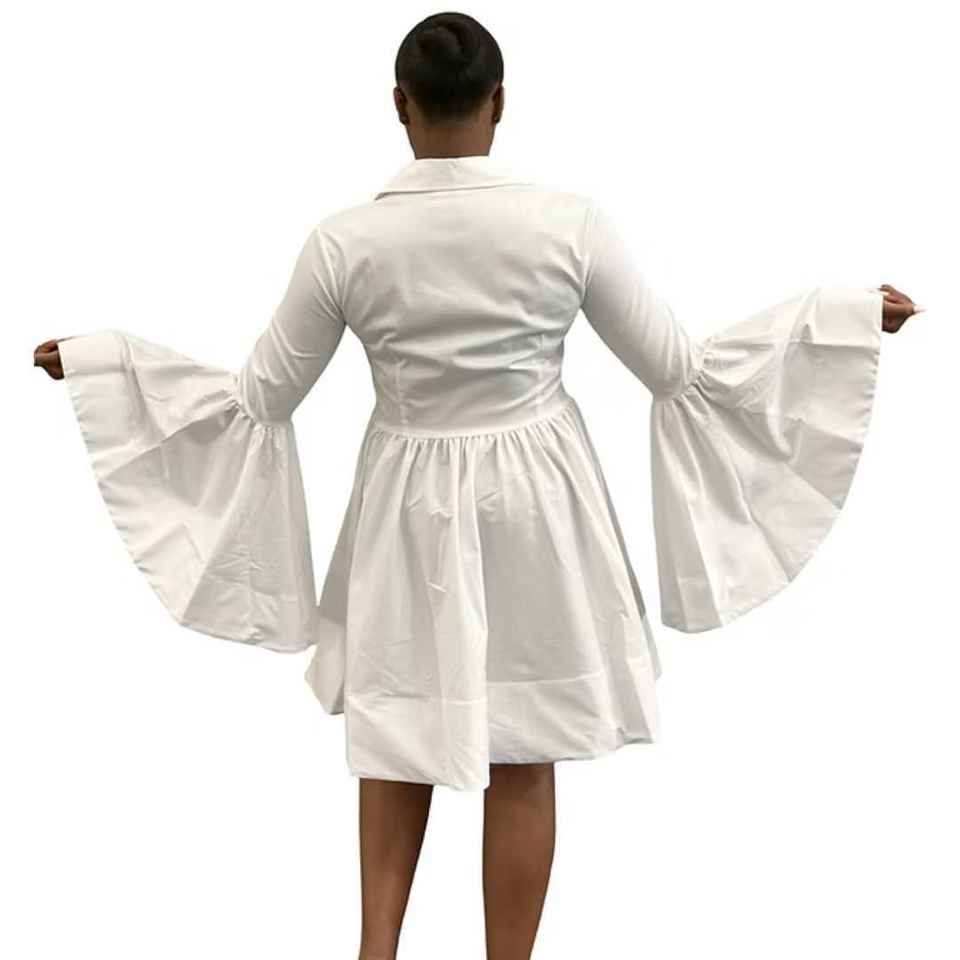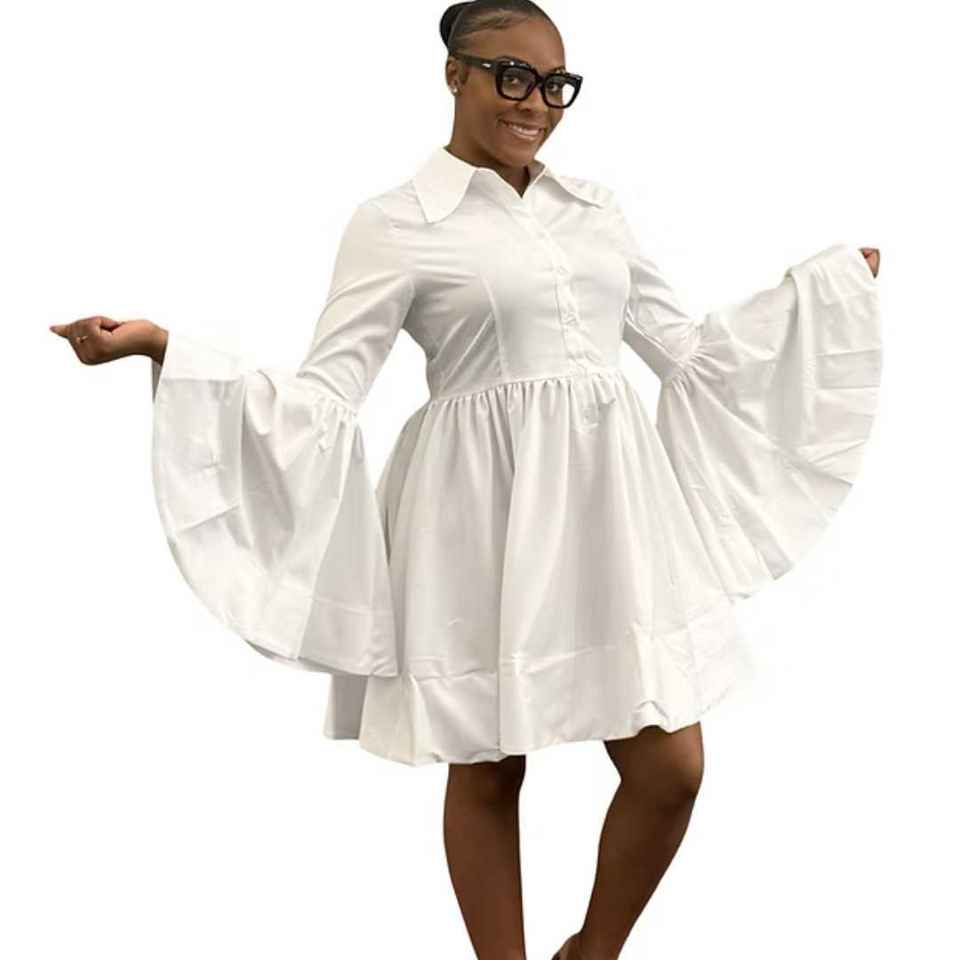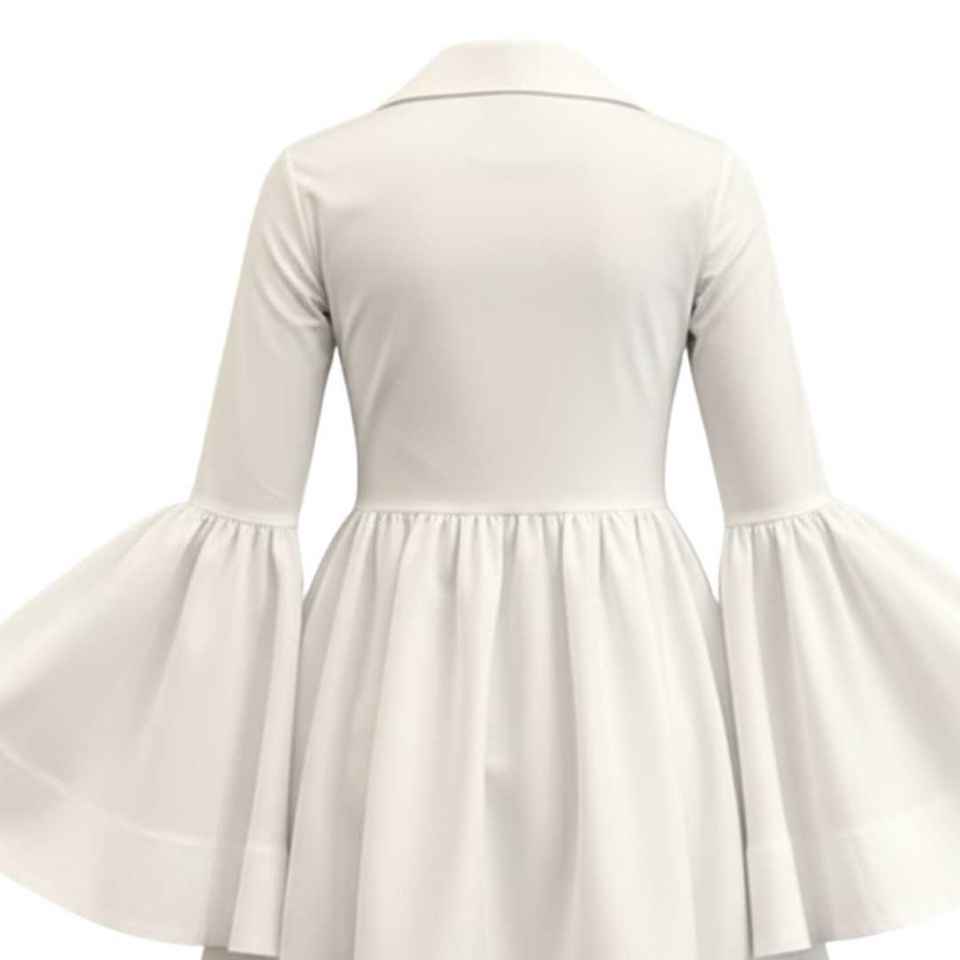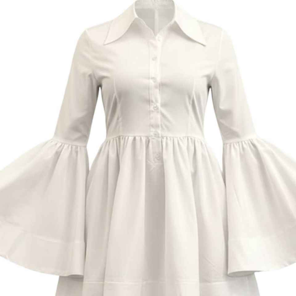 ชุดเดรสผ้าป๊อปลินสีขาวสำหรับผู้หญิง แขนยาวทรงระฆัง ชายกระโปรงบาน สไตล์หรูหราลำลอง แฟชั่นบูติก