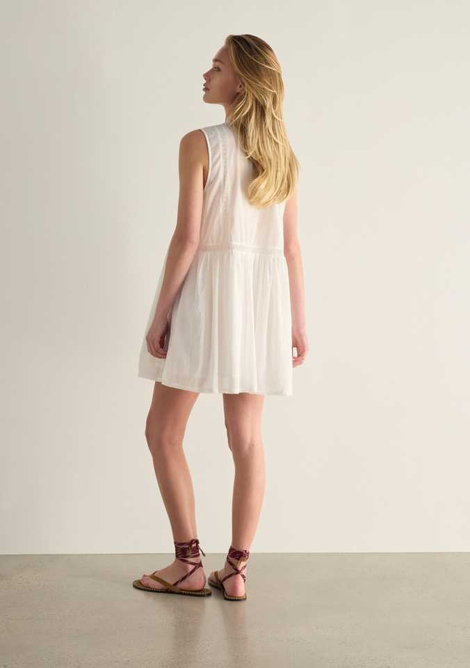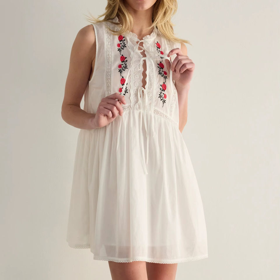 เดรสยาวสีขาวแขนกุด คอจีน แต่งลูกไม้ เรียบง่าย ย้อมสีธรรมชาติ เป็นมิตรกับสิ่งแวดล้อม ระบายอากาศได้ดี ซักได้ ผ้าฝ้าย ใส่สบายๆ ในฤดูร้อน