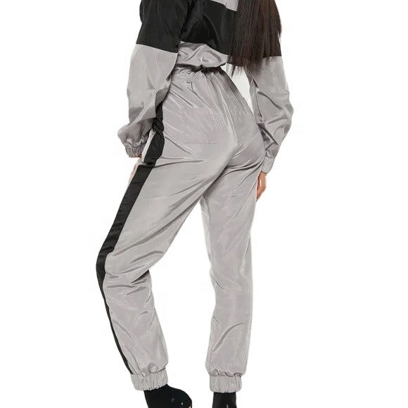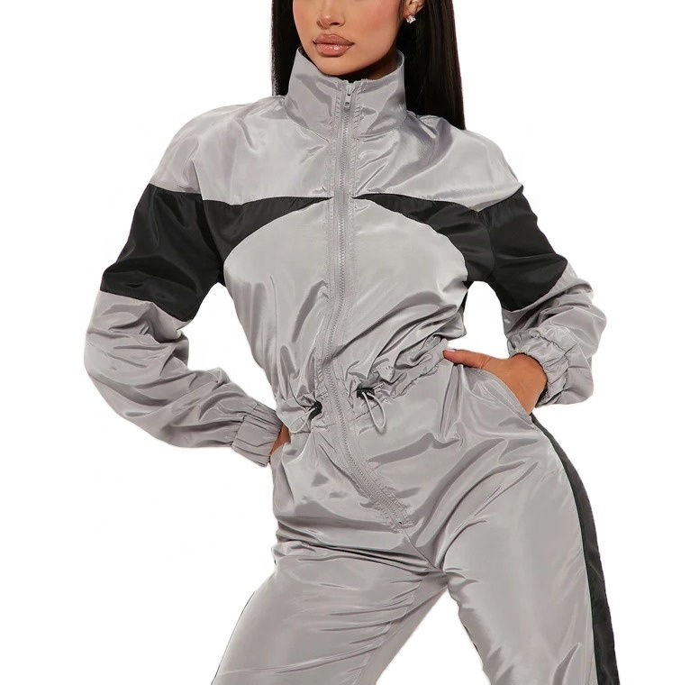 ชุดวอร์มผู้หญิงแบบมีซิป เสื้อแจ็คเก็ตครอปและกางเกงจ็อกเกอร์ น้ำหนักเบา ผลิตจากโพลีเอสเตอร์ 100% ผ้าไนลอน