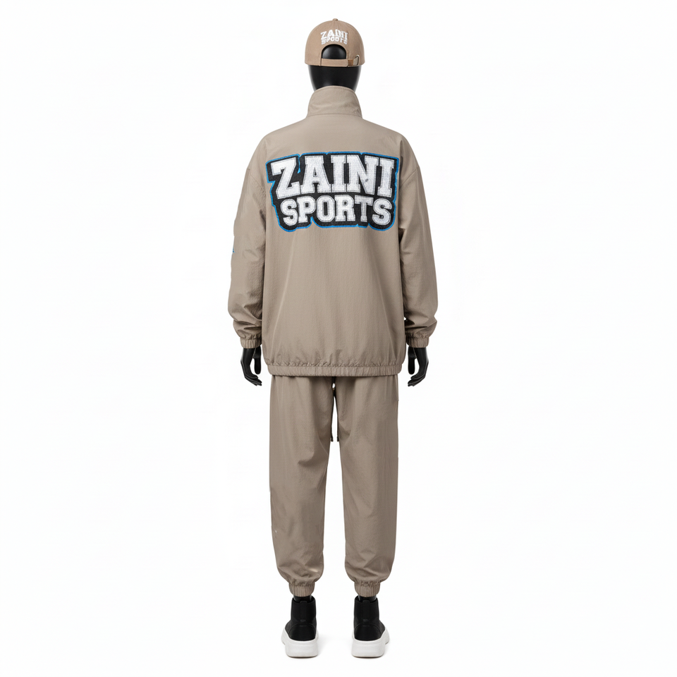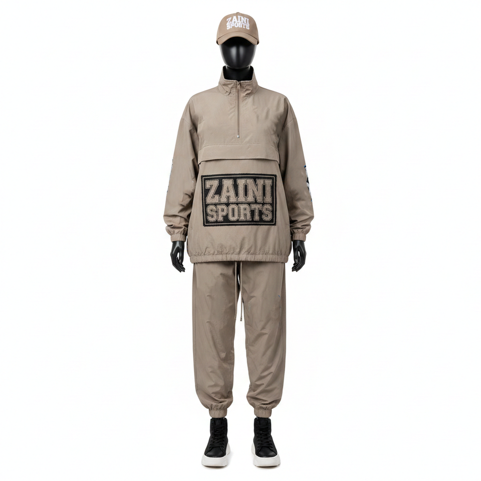 ชุดเสื้อกันลมผู้หญิง ผ้าโพลีเอสเตอร์ทอเนื้อนุ่ม สีเบจ พร้อมป้ายทอโลโก้แบบกำหนดเองฟรี ชุดเสื้อกันลมไซส์ใหญ่