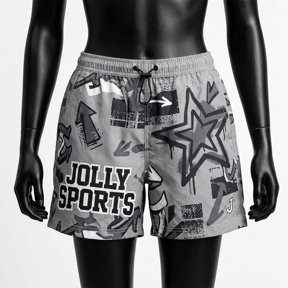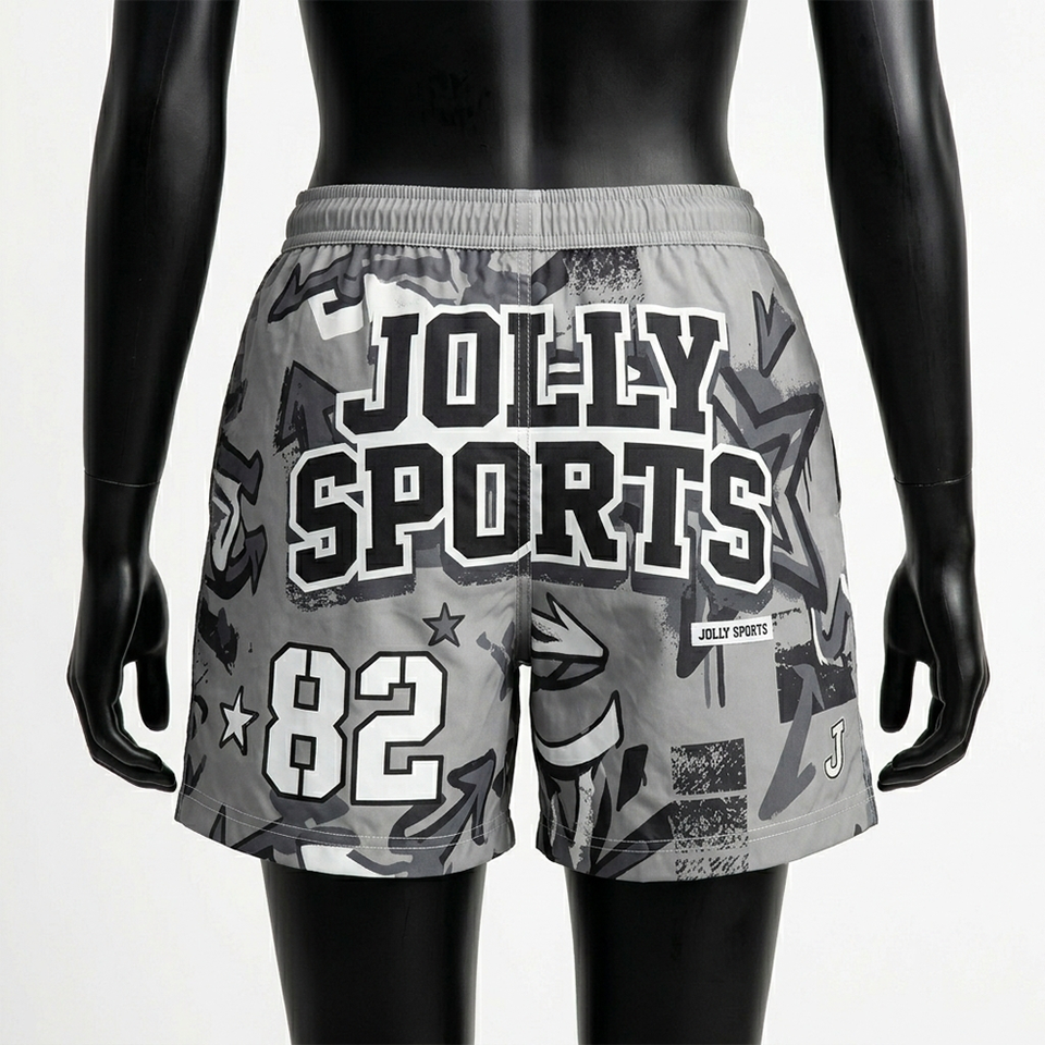 กางเกงขาสั้นผู้หญิงแบบกันลม 120 GSM โพลีเอสเตอร์ ทัสลอน แห้งเร็ว สีเทา สีดำ พิมพ์ลายกราฟิก ซับลิเมชั่น โลโก้สั่งทำได้
