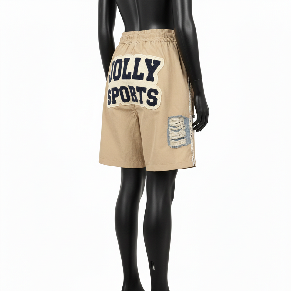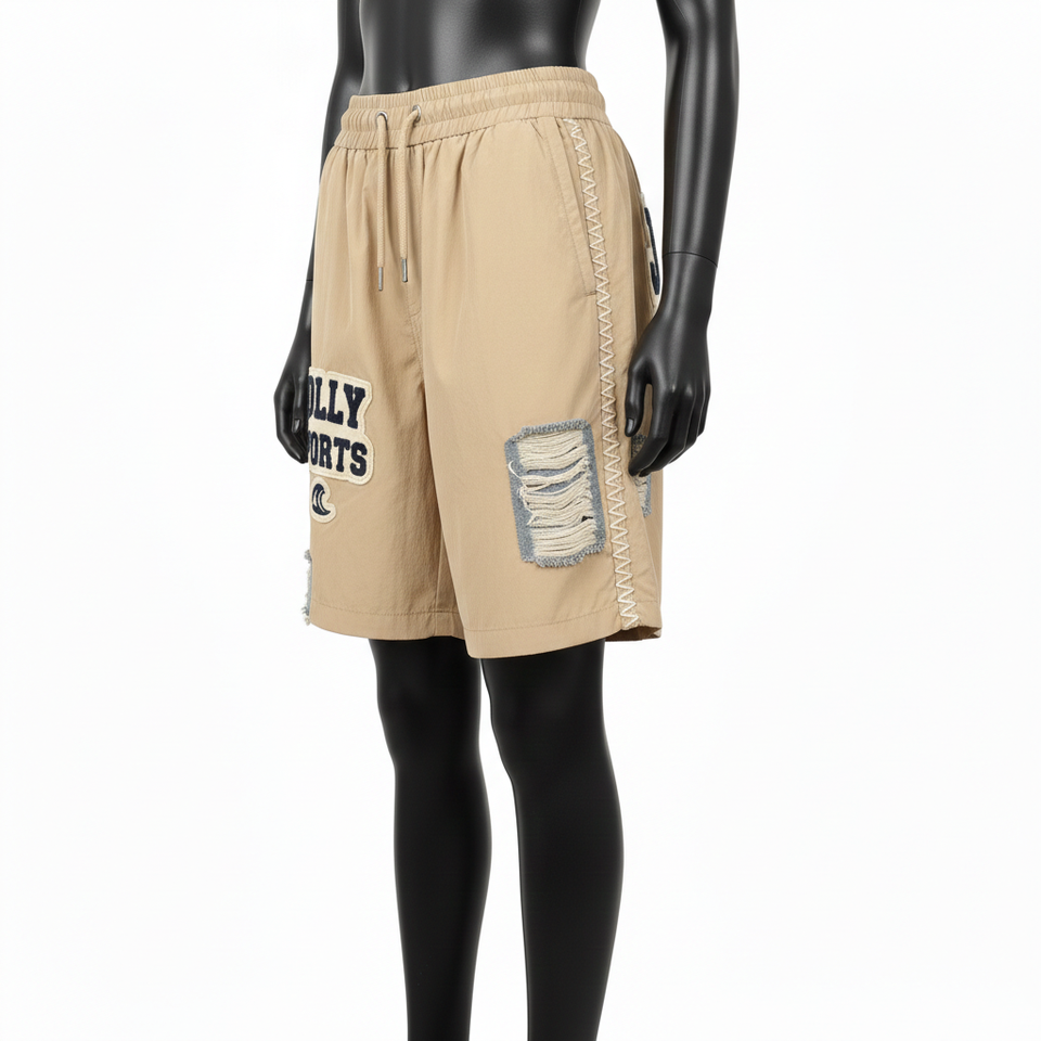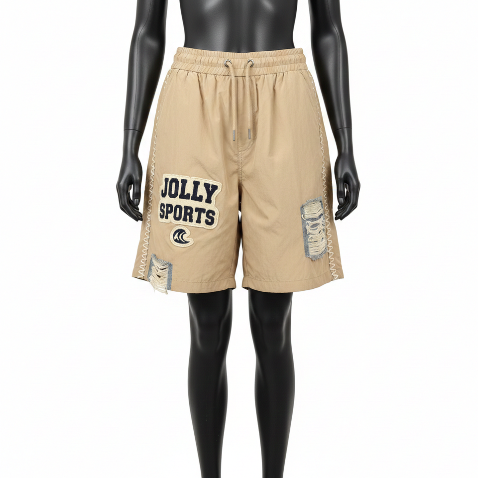 กางเกงขาสั้นผู้หญิงแบบมีซิป ผ้าไนลอนน้ำหนักเบา สีเบจ สีกากี แต่งลายซิกแซก ปักลายเชนิลล์ พร้อมปักโลโก้ตามสั่ง