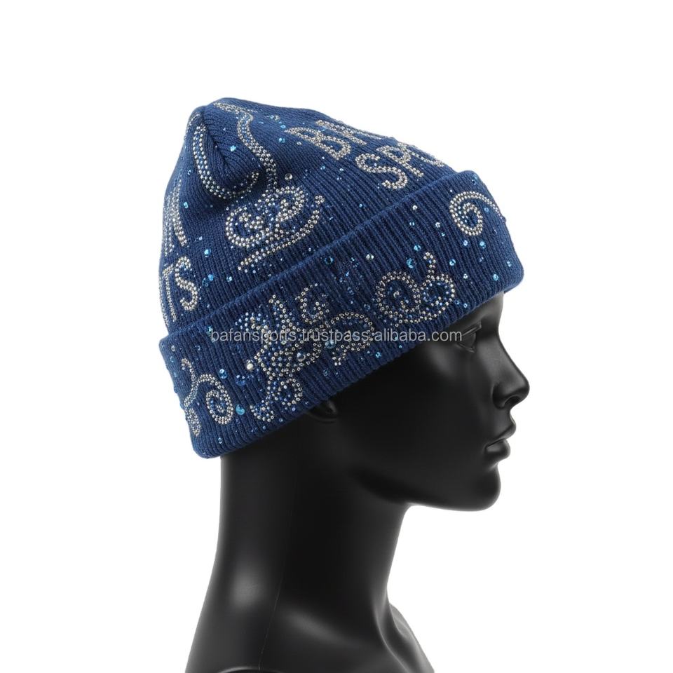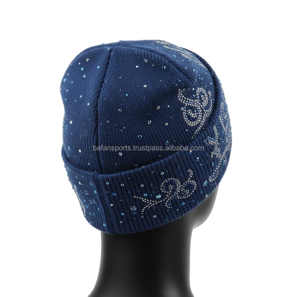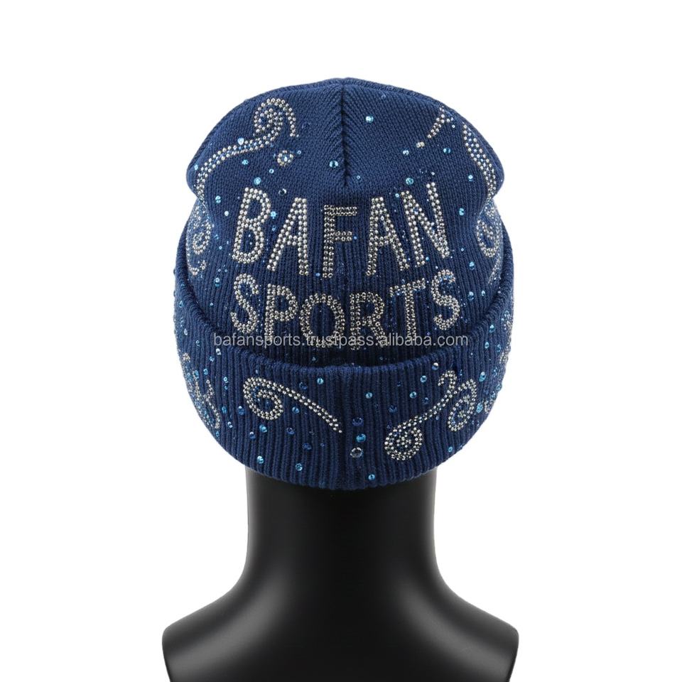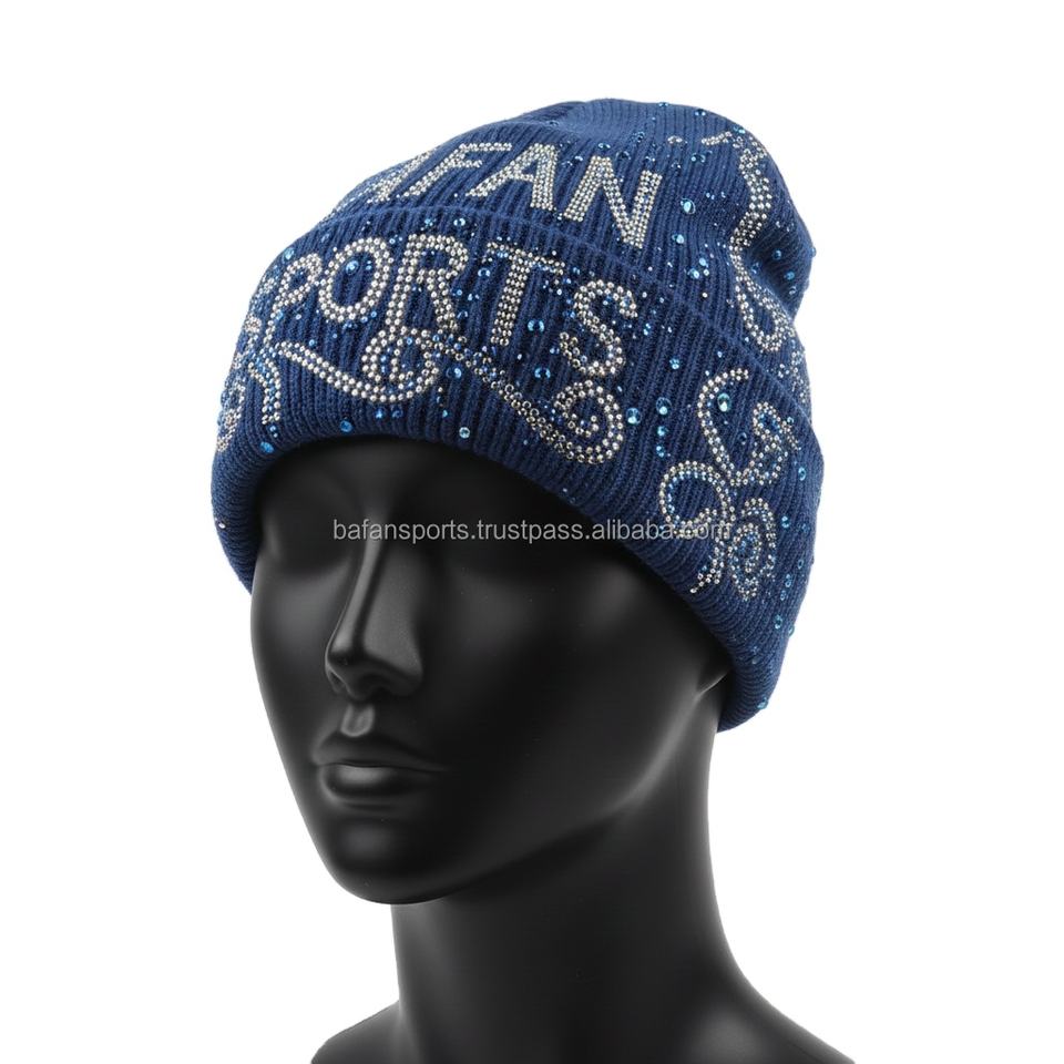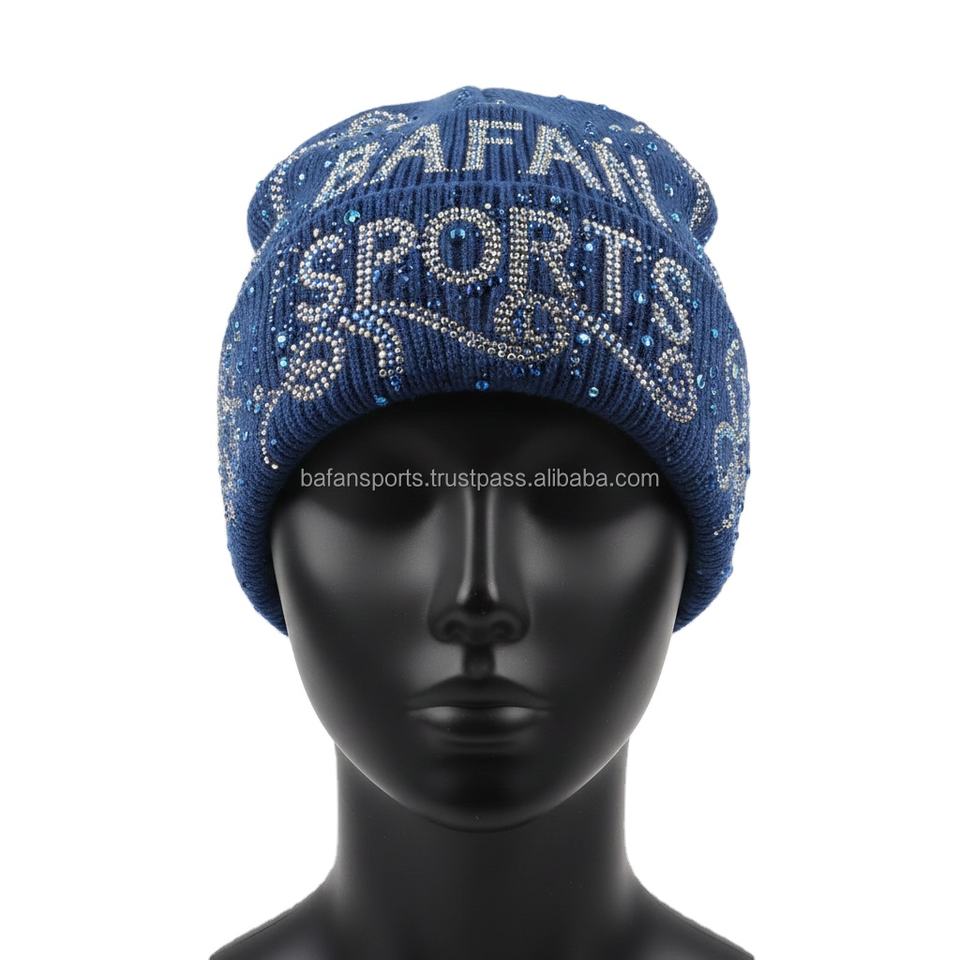 หมวกบีนนี่ไหมพรมอะคริลิคสำหรับผู้หญิง สีน้ำเงิน ประดับคริสตัล งานถักมือ สไตล์วิบวับ ลายแจ็คการ์ด รับสกรีนโลโก้