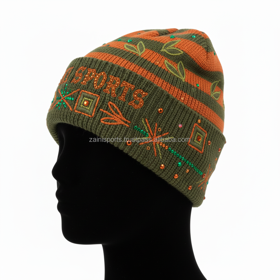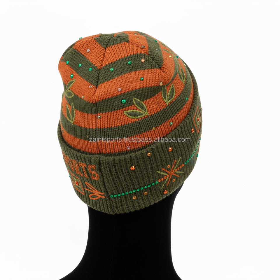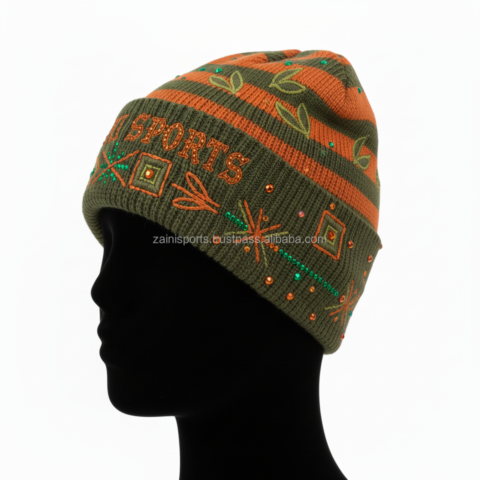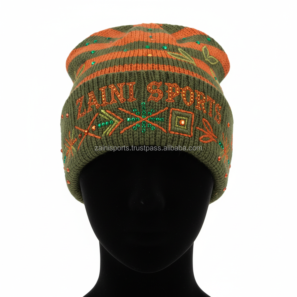 หมวกบีนนี่ฤดูหนาวของผู้หญิงหมวกบีนนี่ปักลายด้วยขนแกะอะคริลิค GSM 320ดีไซน์สีส้มมะกอกกำหนดโลโก้ได้ตามต้องการ