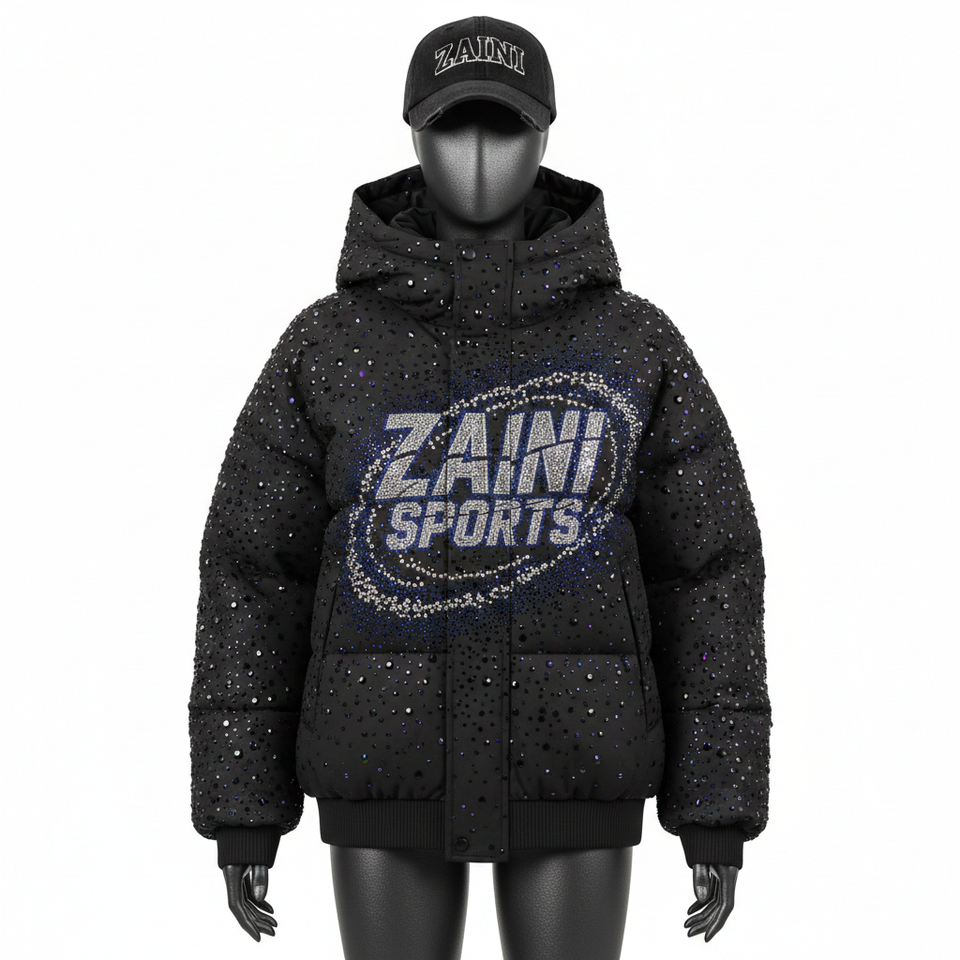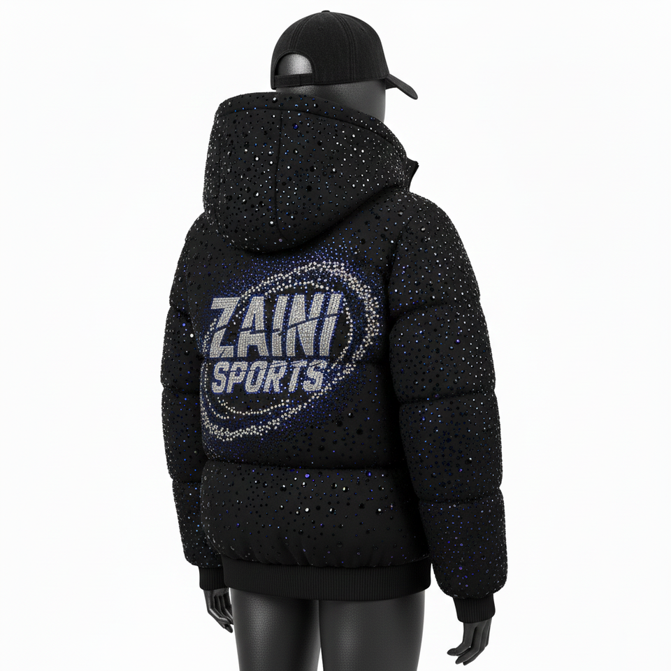 เสื้อแจ็คเก็ตพัฟเฟอร์สำหรับผู้หญิง ผ้าโพลีเอสเตอร์คุณภาพสูง ดีไซน์แบบควิลท์ ประดับคริสตัลติดด้วยความร้อน พร้อมโลโก้สั่งทำพิเศษ