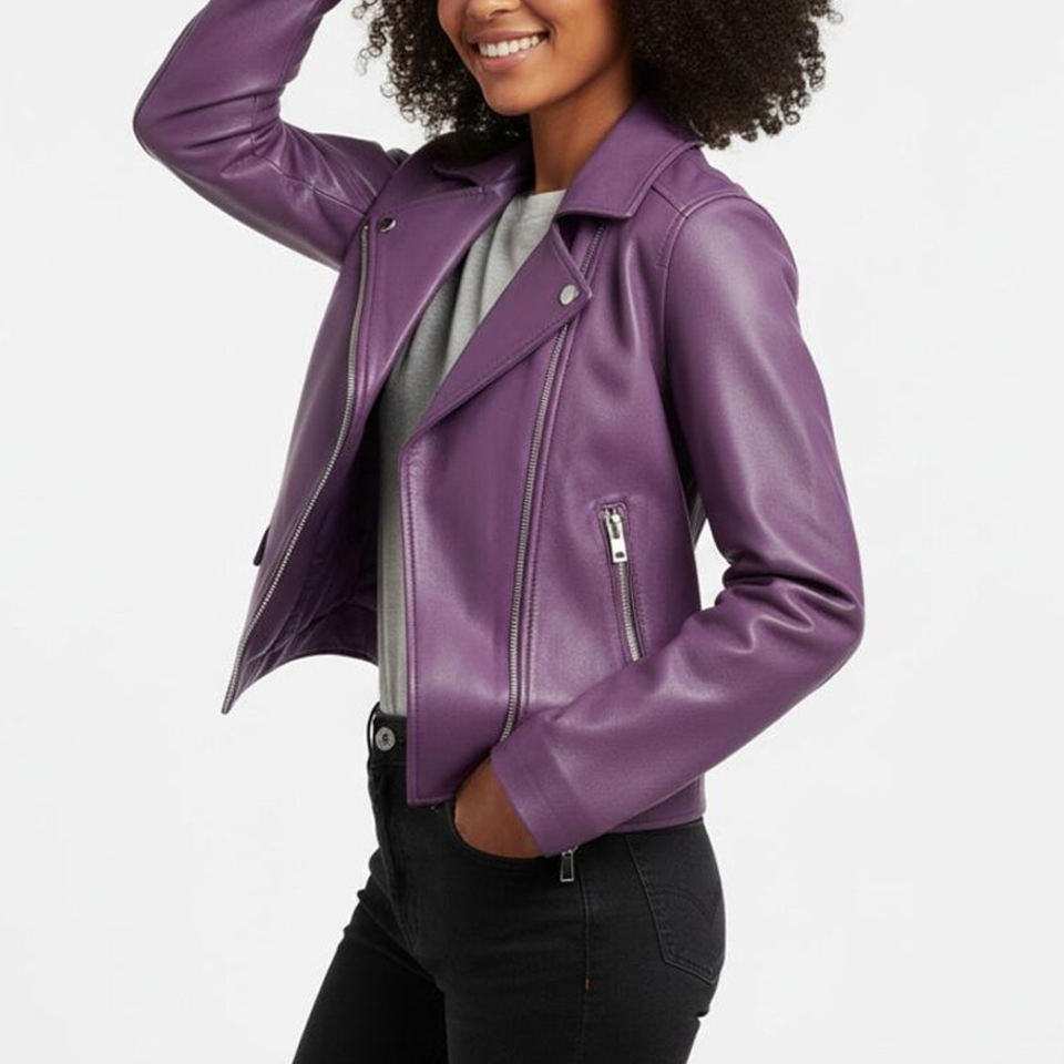 เสื้อโค้ทแฟชั่นผู้หญิงเข้ารูปผิวแกะสีม่วงระบายอากาศได้ดี