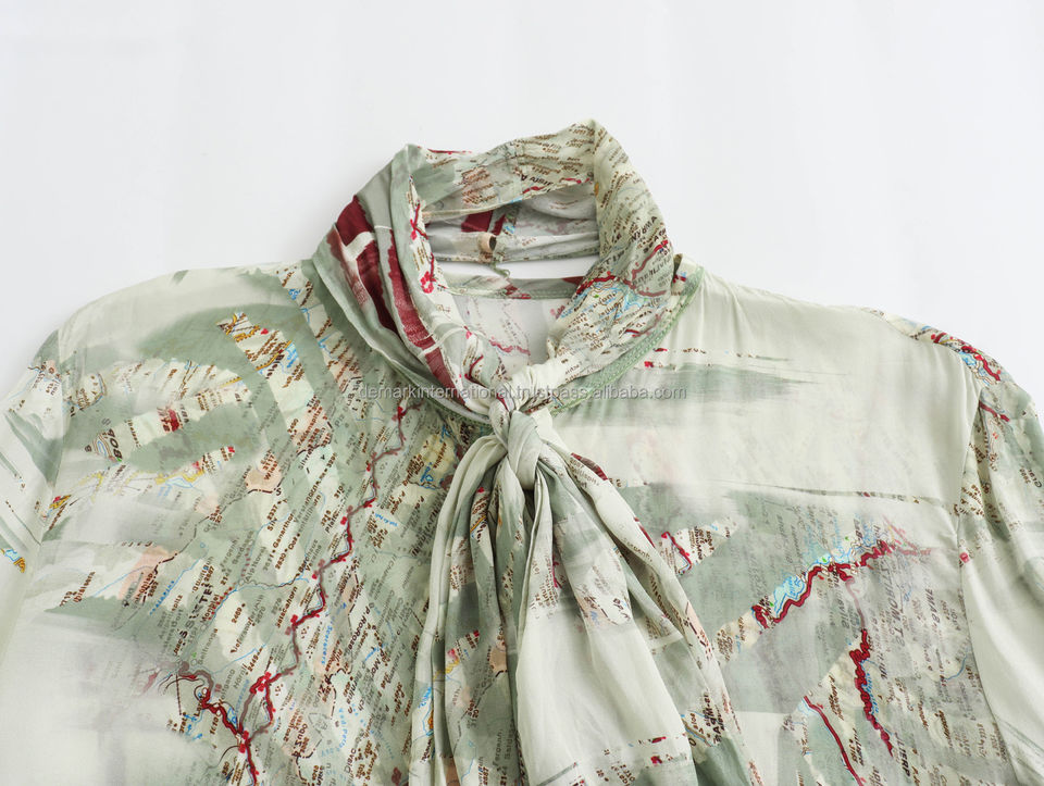 เสื้อเชิ๊ตพิมพ์ลายโบว์วินเทจคอกลมแขนยาวติดกระดุมเสื้อผู้หญิงเสื้อเบลาส์เสื้อสุดชิค